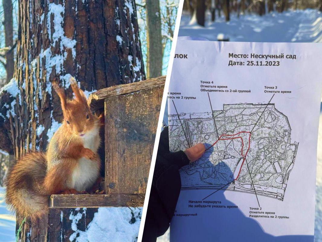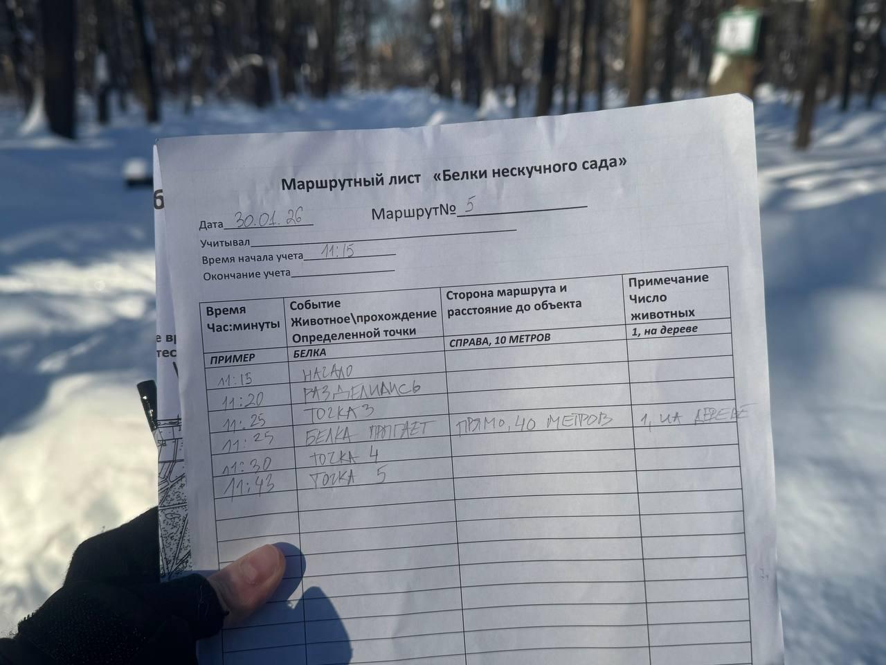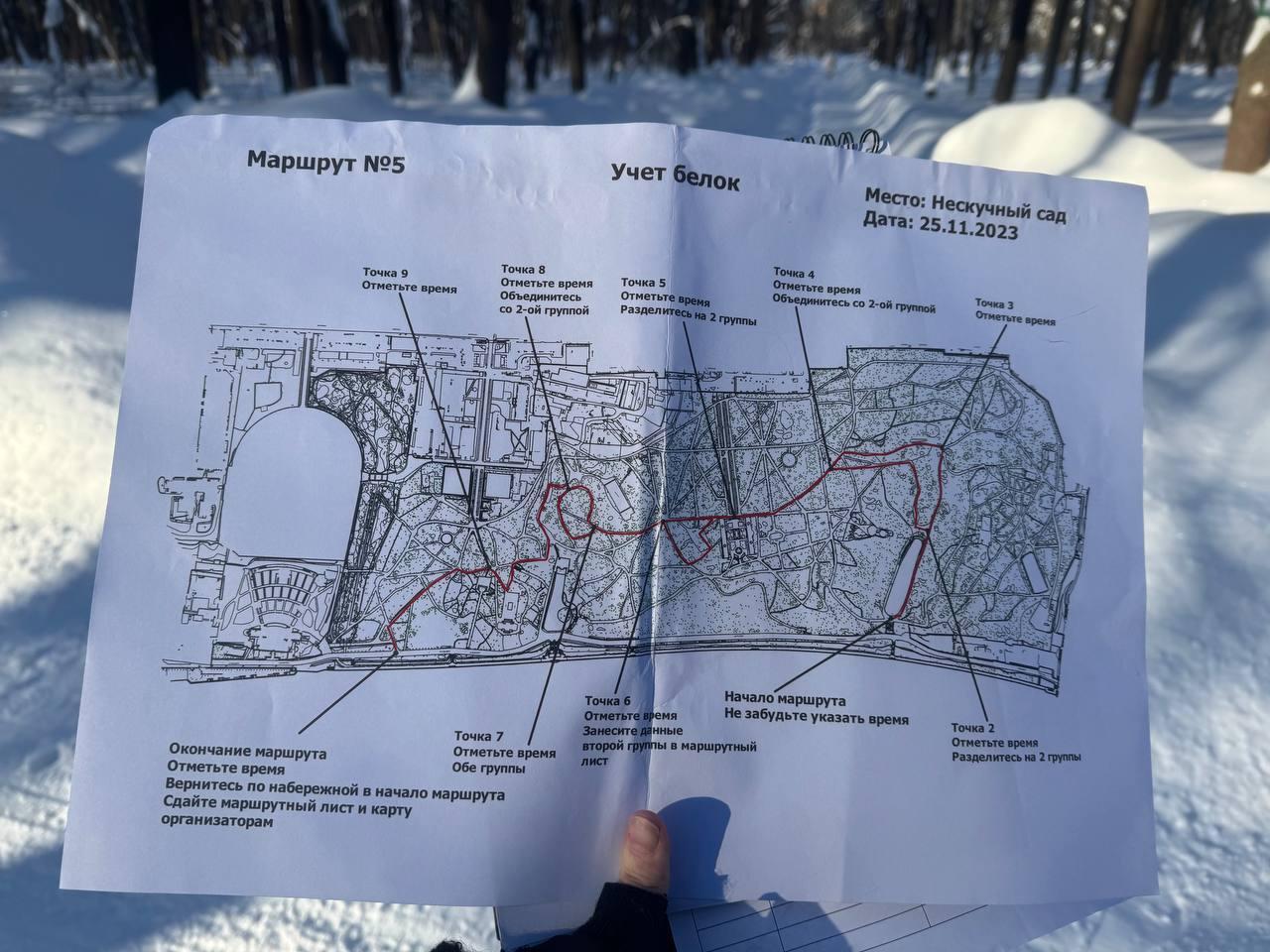 There are several routes, following the paths of Neskuchny Garden. At some points, the routes of the groups — which were split into teams of 2–4 people — intersect, but there are few such points. The goal of the participants was to walk slowly along the snowy paths and peer into the treetops. Upon spotting a squirrel, we had to make a note in the observation diary. In general, we had to record all events, including reaching points on the route, the distance to the spotted animals, and the direction in which they were found. All this will be needed by the zoologists for the count. This way they will understand exactly where we saw the beauty and whether it«s the same squirrel that other participants saw.