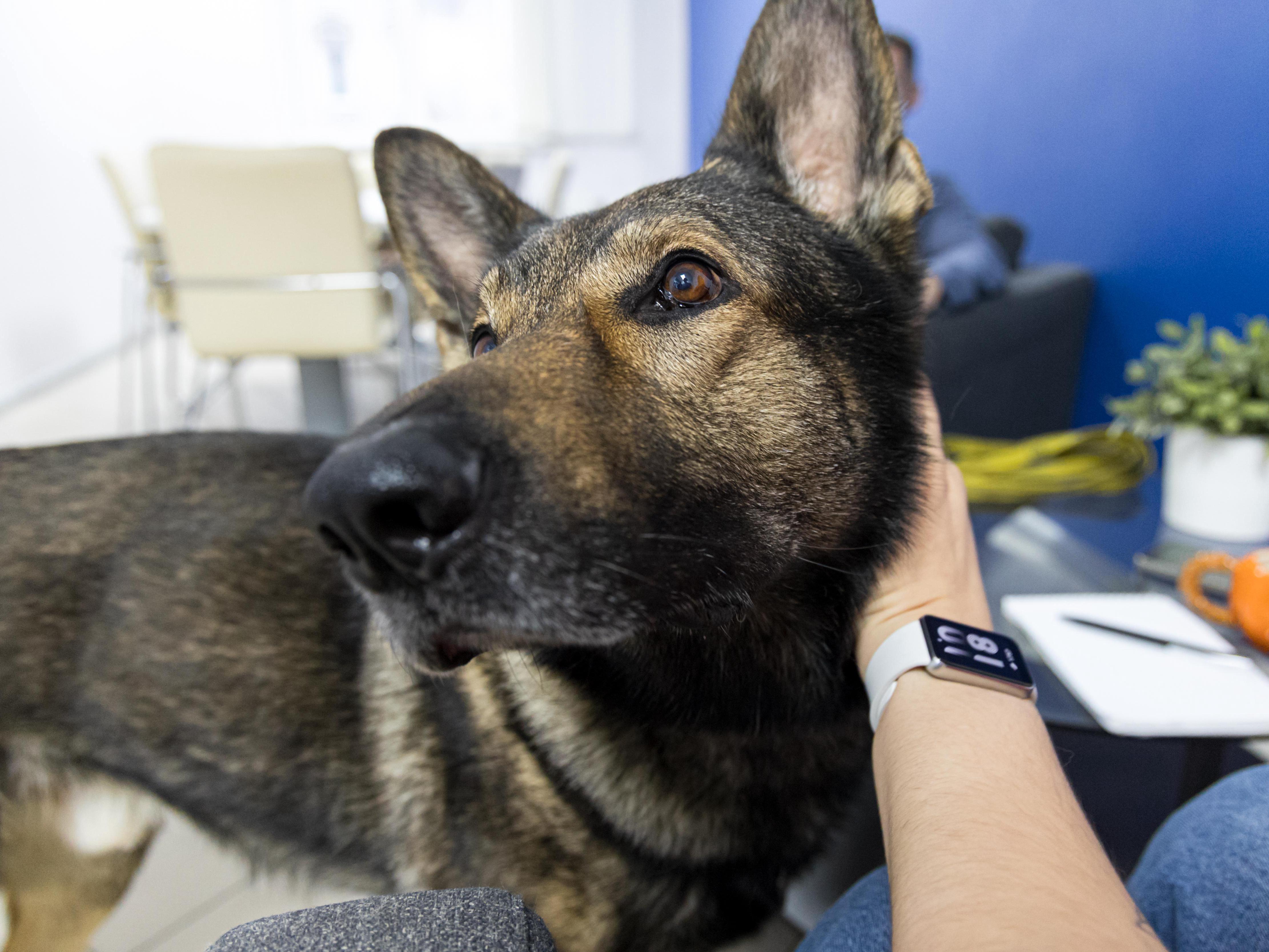 During the interview, Yermak showed us the commands «Ashamed,» «Bunny,» gave his paw to his owner, and even stirred up the editorial office with his loud bark. By the way, Yermak is not just a German shepherd, he has a rich pedigree, hence his unusual coloration.