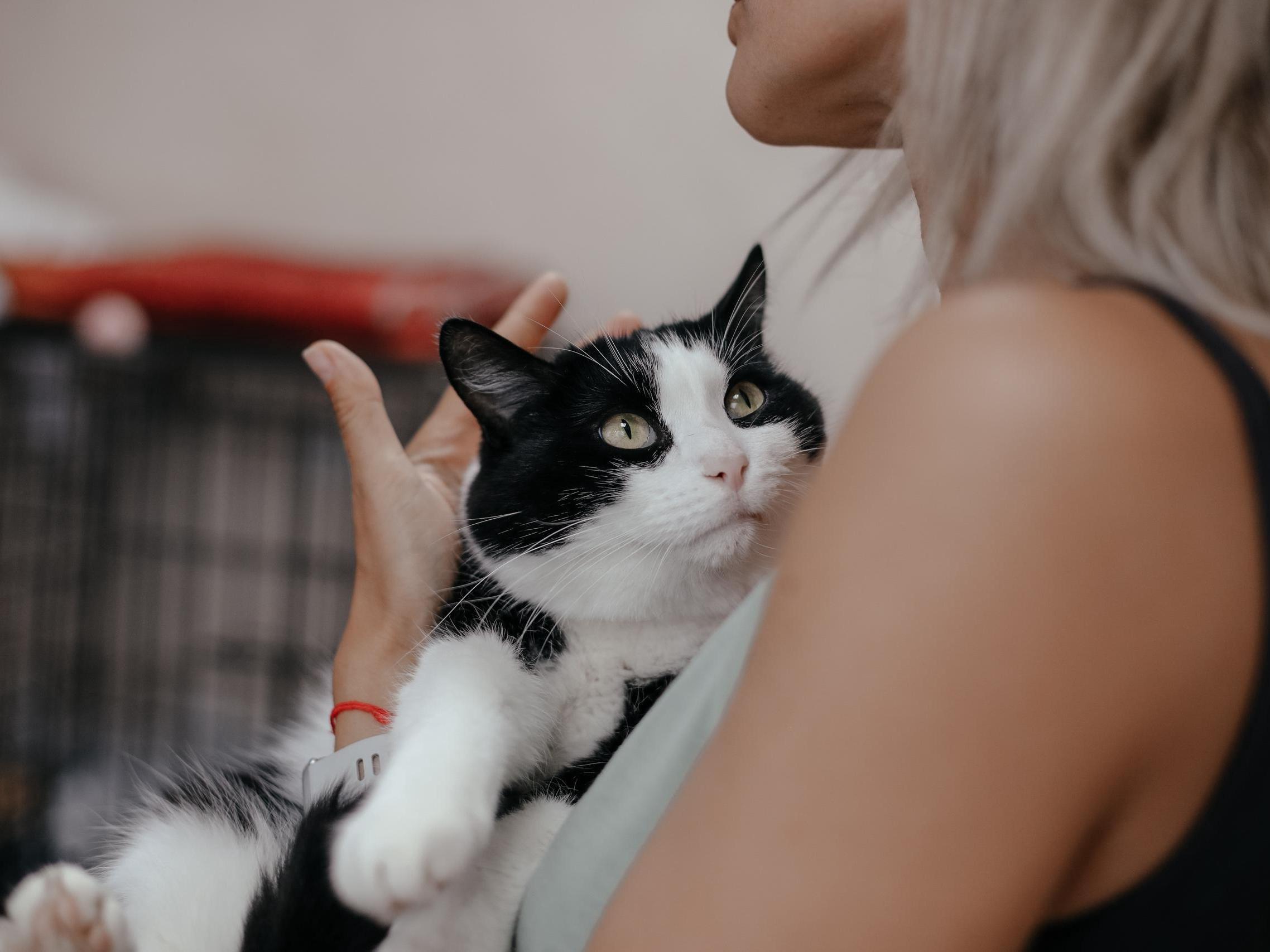 The toothless cat Kuzya sits peacefully in the arms of a shelter volunteer.