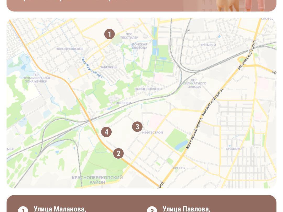 Krasnoperekopsky District is equipped with four dog walking spots across its neighborhoods.