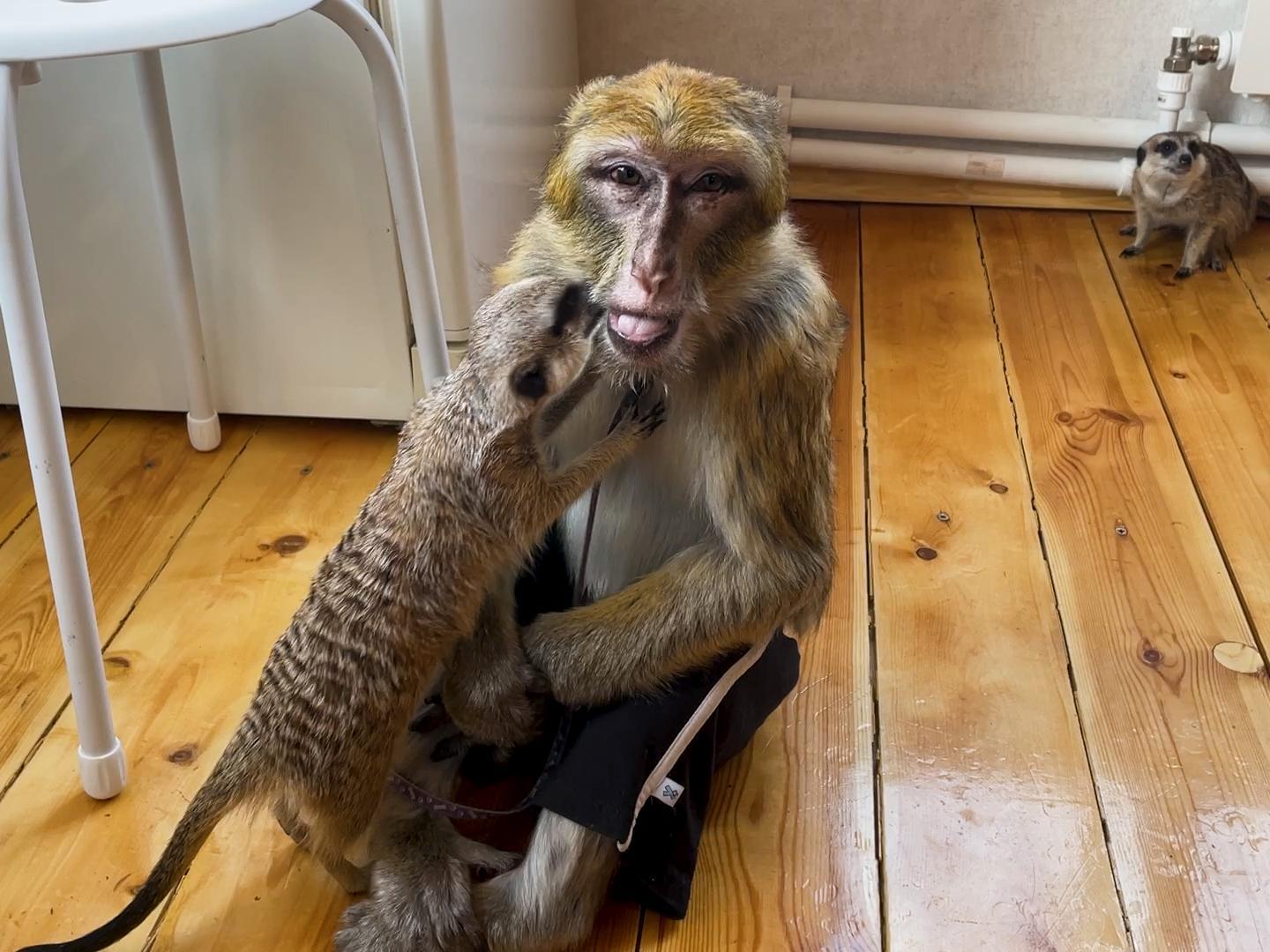 Yakov, Lelik and Zhulik are best friends. The macaque immediately accepted the new acquaintances, now they spend a lot of time together, sometimes even sleep curled up. The diet of meerkats is specific. Specifically for them, the owners breed beetles, feeding Lelik and Zhulik with their larvae. However, this is more of a treat, as they contain a lot of protein and can upset the balance. Therefore, on the recommendation of veterinarians, meerkats eat special cat food.