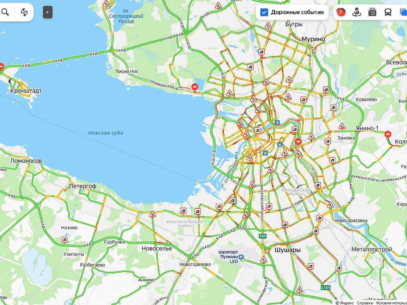 During the evening rush hour on January 29, traffic intensity in St. Petersburg reached 7 points on the congestion scale. According to the Yandex Probki service, this indicator is one point higher than the standard load for this time.