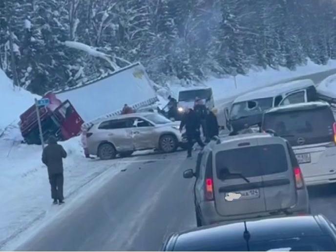 On the 83rd kilometer of the R-257 «Yenisei» highway between Verkhnyaya Biryusa and Divnogorsk, traffic was completely blocked on the evening of February 2 due to a major accident. According to preliminary information, five cars collided at the site — the vehicles sustained serious damage and occupied the roadway.