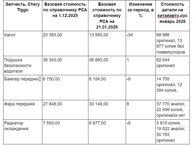 Separately, we note that over the past year, some parts on the market have also noticeably increased in price. For example, the (original) hood and radiator for a Mercedes rose by 170% and 31% respectively, while the airbag and bumper became cheaper by 68% and 37%. For the Chery Tiggo, more items from our set became more expensive: the radiator went up by 9%, the hood by 17%, the bumper by 23%, and the airbag «grew» by 251%. Recall that Chery, under the Tenet brand, has been assembled at the plant in Kaluga for almost a year by AGR, and it would seem airbags should be plentiful and cheap, but no.