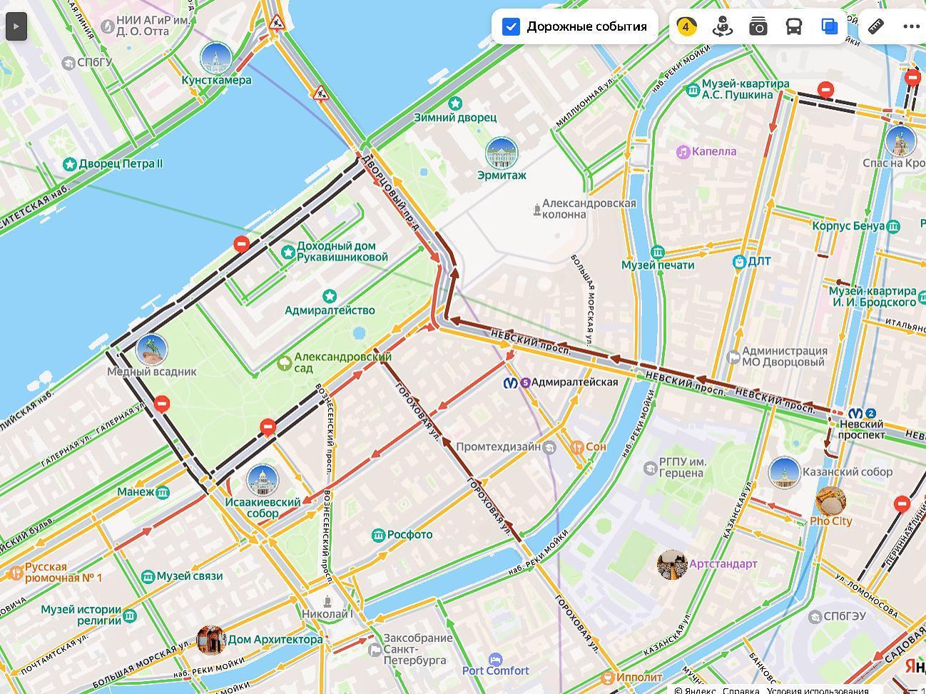 At the same time, road closures were introduced in the center, near the Admiralty. It was impossible to drive along Admiralteyskaya Embankment and Admiralteysky Prospekt. Congestion formed on several streets: