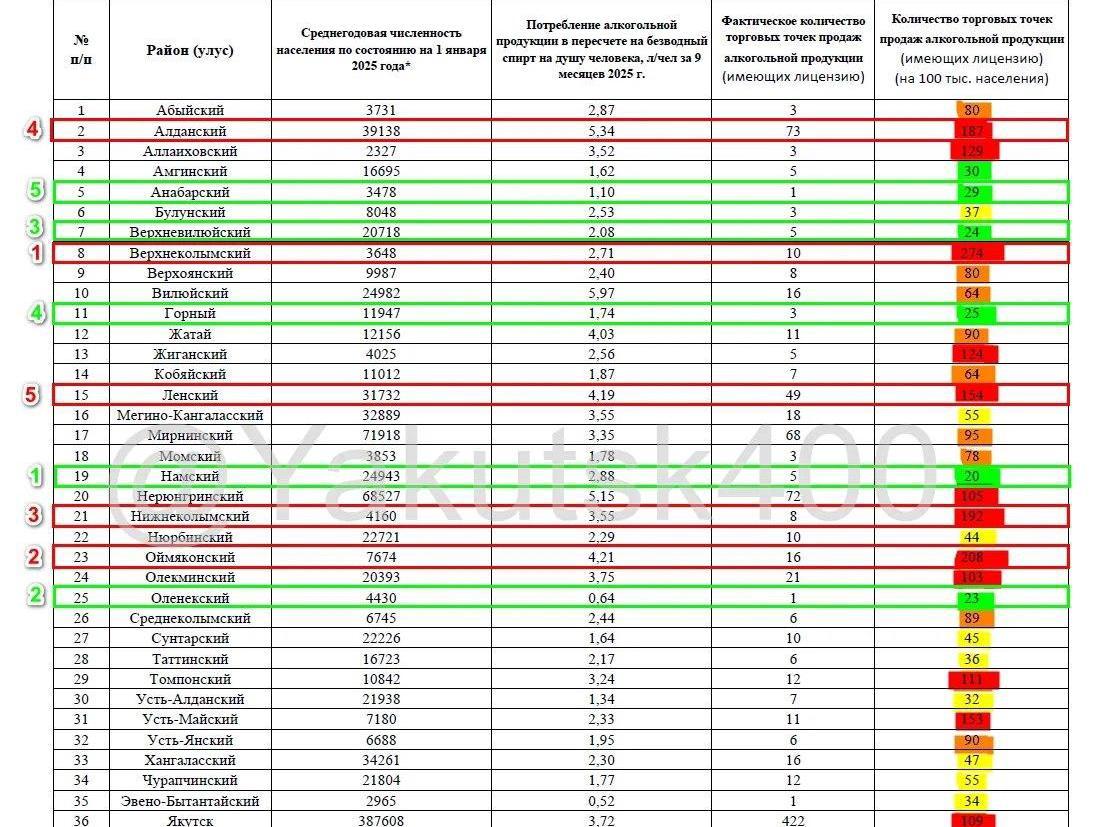 When it comes to actual consumption, the leader is the Vilyuisky district, with a population of 30,142 people. However, the district has only 15 registered alcohol sales points, but consumption remains one of the highest in the republic — in the first 9 months of 2025, each resident consumed 5.97 liters of anhydrous alcohol. For comparison: this is equivalent to approximately 15 liters of vodka.
