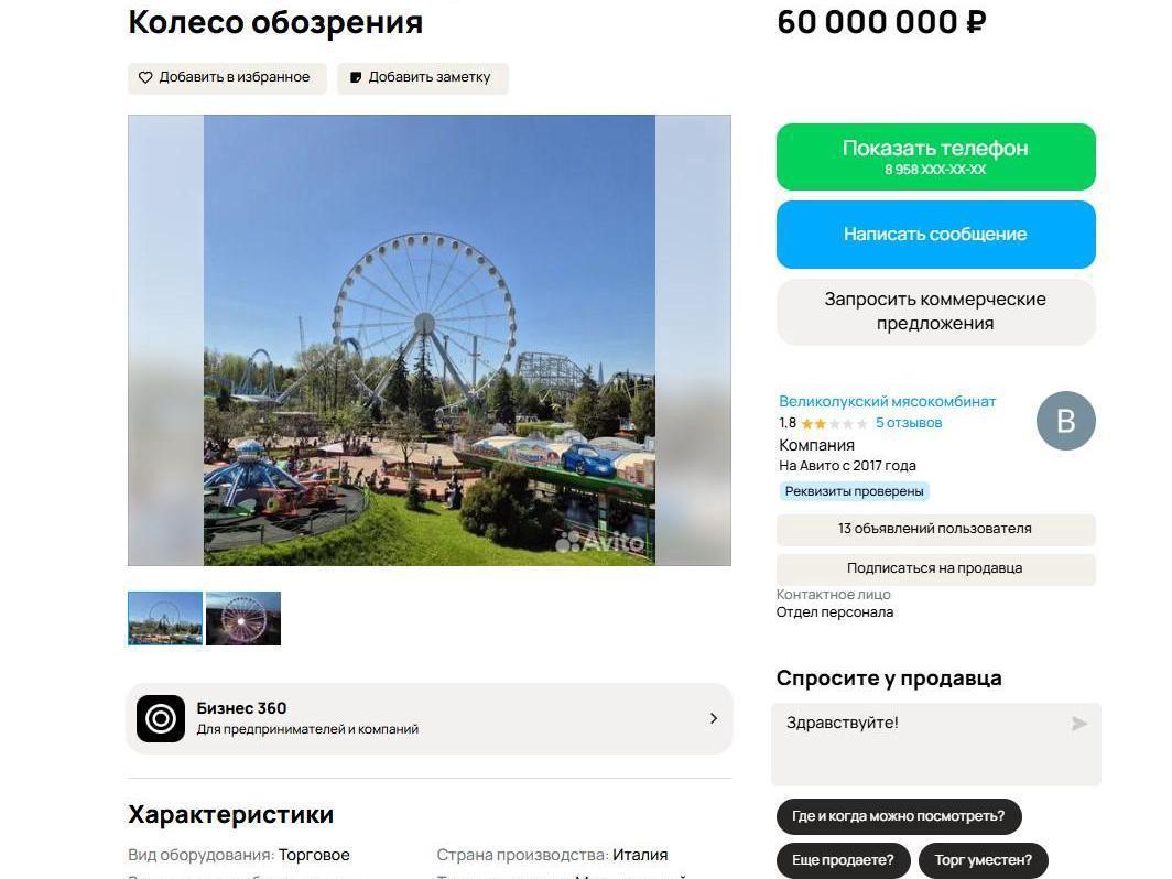 The Ferris wheel, previously operated at the St. Petersburg park Divny Ostrov, has been listed for sale on the Avito platform. The attraction is priced at 60 million rubles (approximately $667,000). The seller in the ad is Velikoluksky Meat Processing Plant, co-owned by Vladimir Podvalny, who is also the owner of the amusement park.