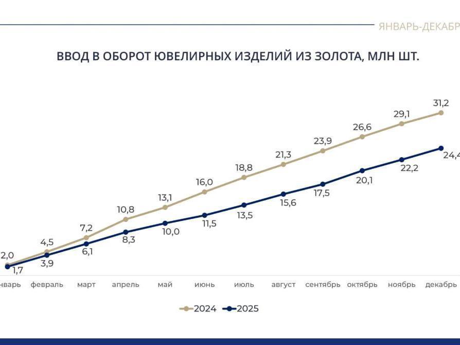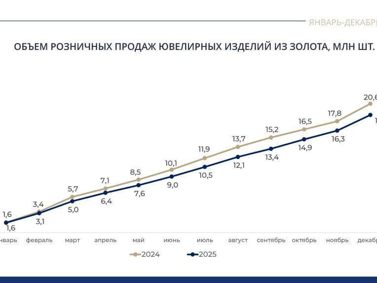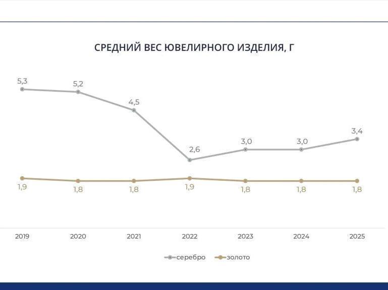 However, statistics from the Federal Assay Chamber show that the average weight of a gold item has been stable over the last three years at 1.8 g, while that of silver has increased from 3 to 3.4 g. At the same time, the total number of gold items introduced into circulation by the end of 2025 decreased by 27% compared to 2024, and retail sales fell by 10% — to 18.8 million pieces. The silver market has been more stable: sales remained at the same level, and the introduction of items even surpassed last year«s figures.