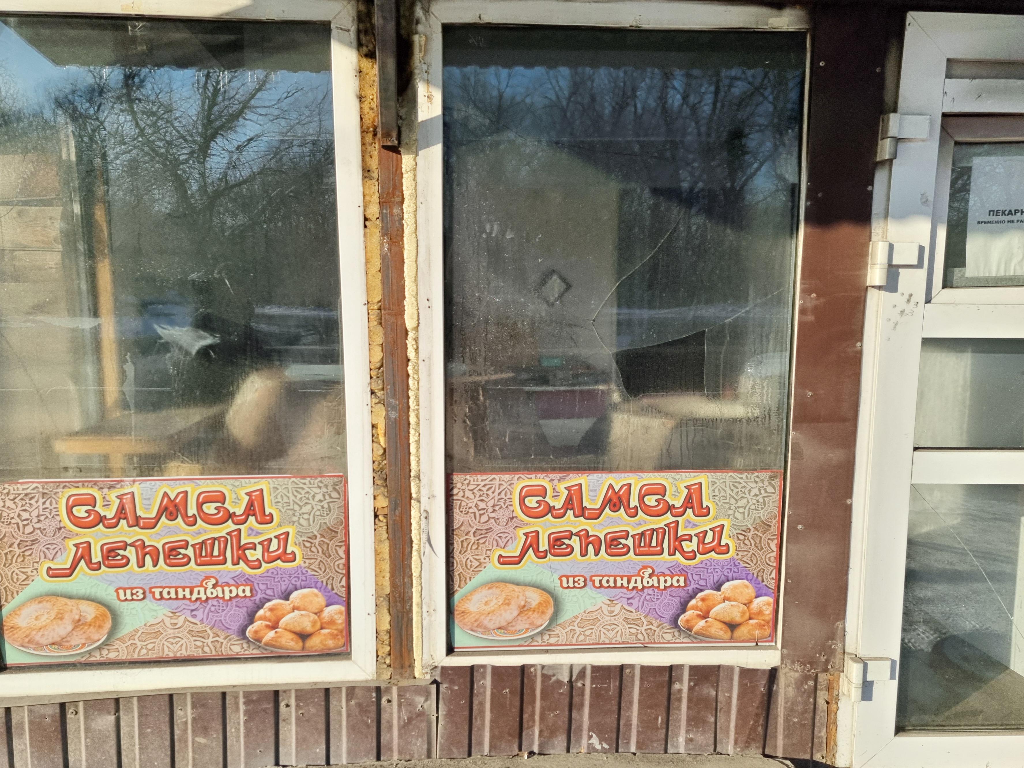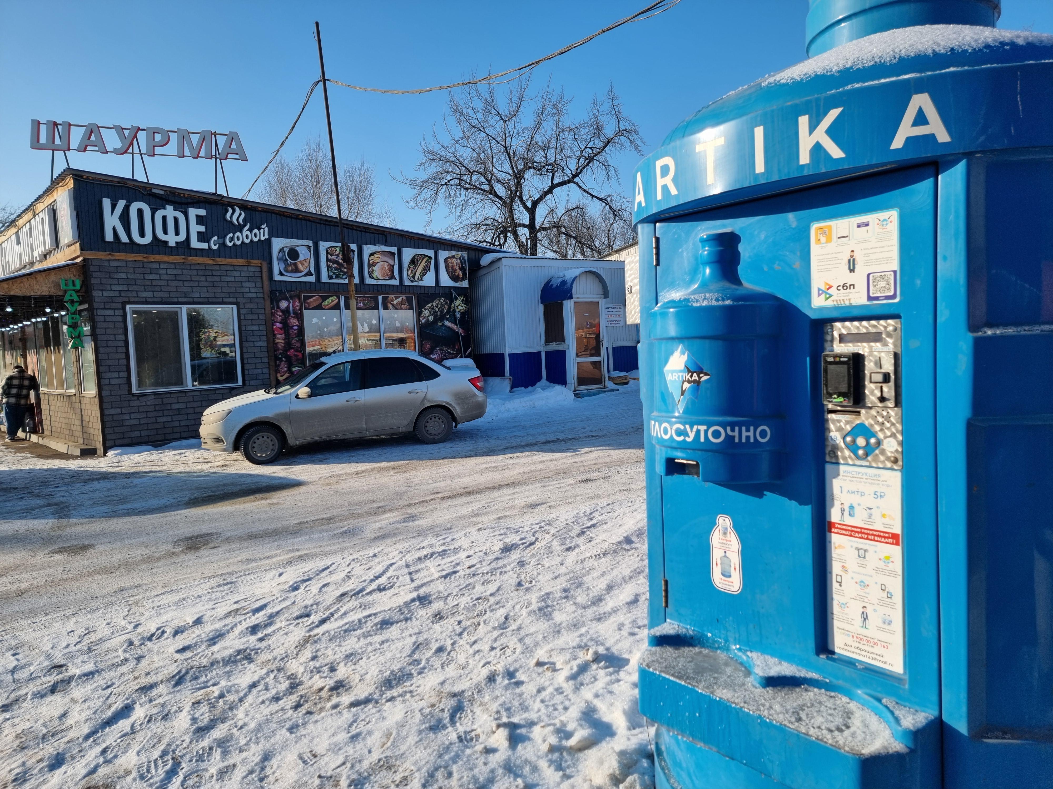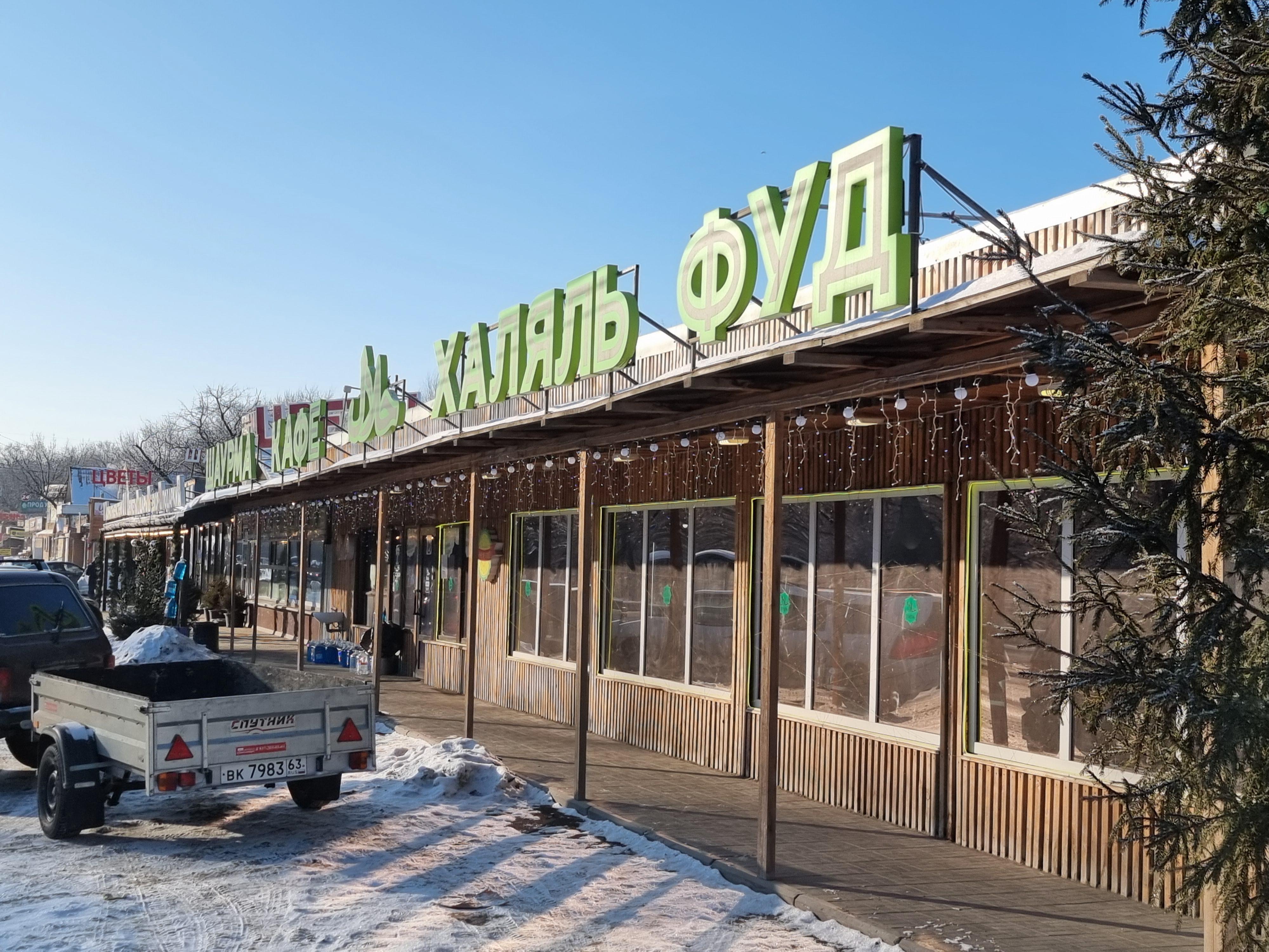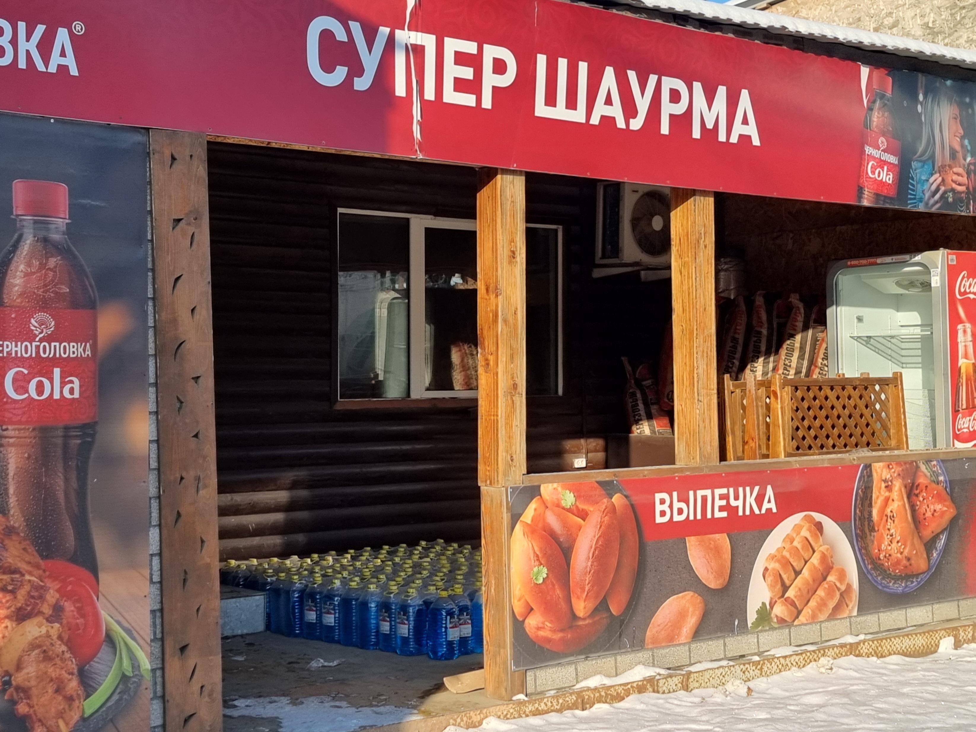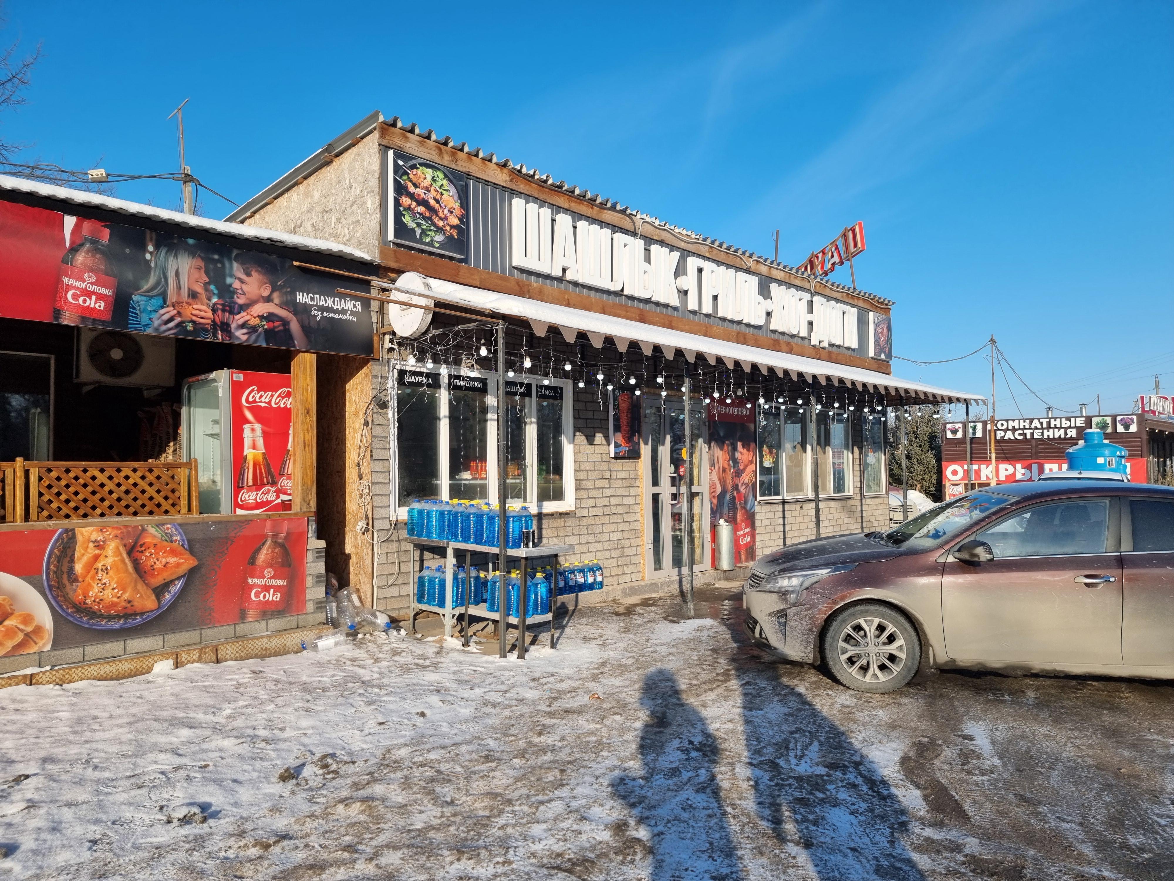 Along the road, there are several cafes. They specialize in Eastern cuisine — shashlik, plov (a rice dish), chebureki. And in fast food: hot dogs, samsa. Next to each cafe, there are stands with antifreeze.