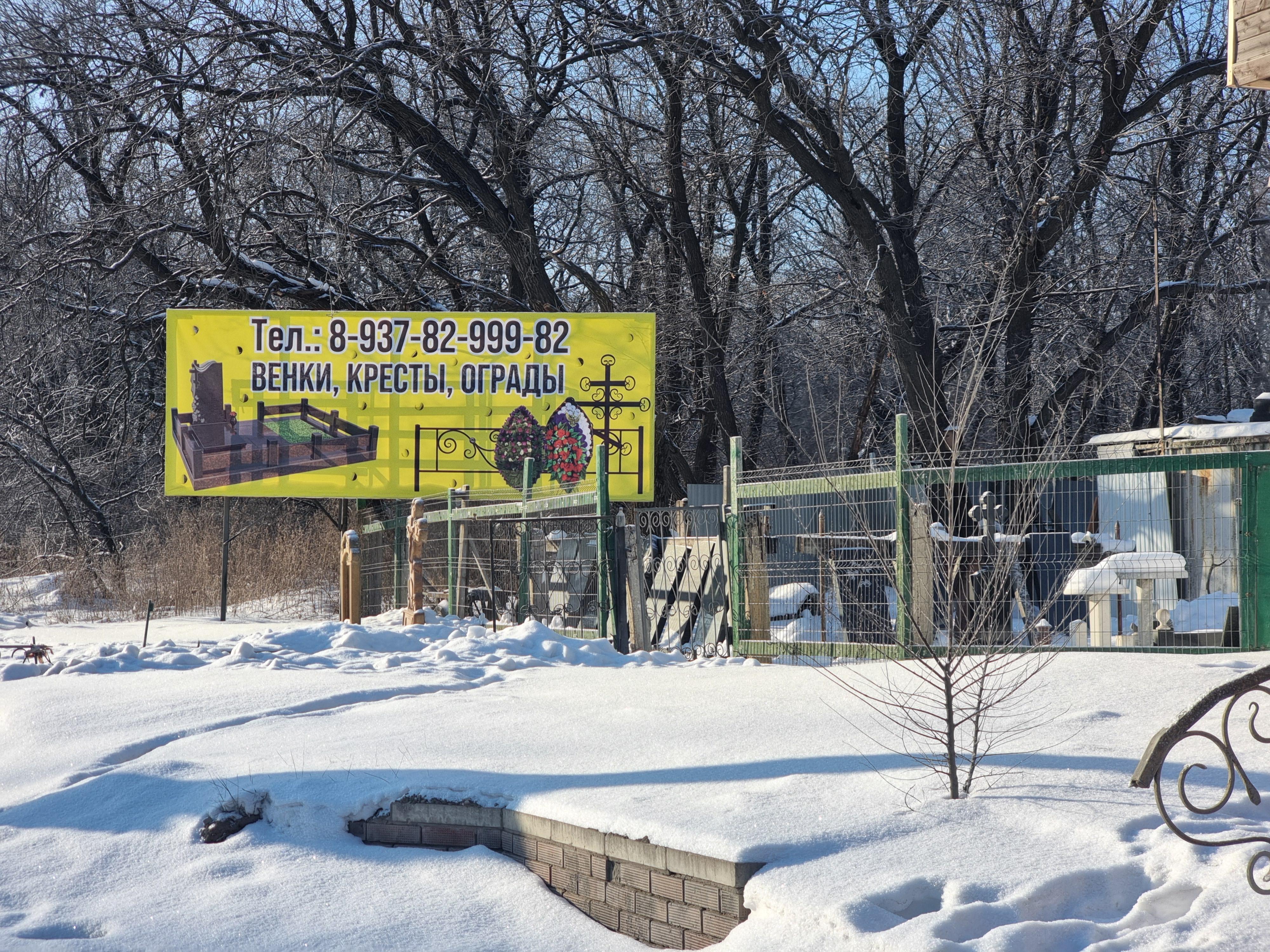 And one of the last trade pavilions just offers to buy everything necessary for the cemetery.