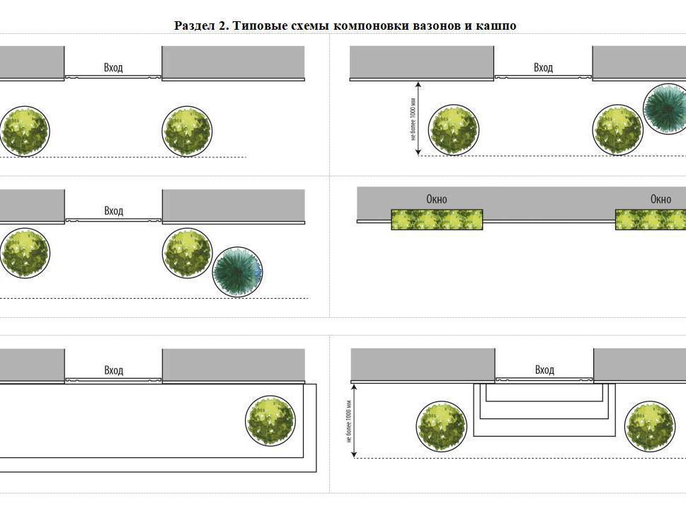 In front of the entrance, no more than two planters are allowed on each side, at a distance of no more than 1 meter from the wall.