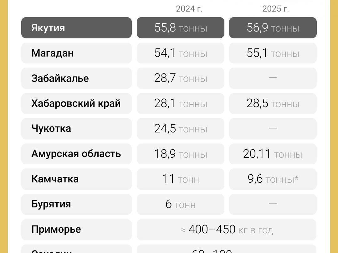 Third place is held by the Transbaikal region, but data for 2025 is not yet available. In 2024, extraction amounted to 28.7 tons of gold.