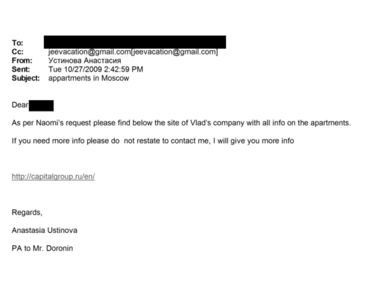 Epstein apparently followed the company and discussed its deals with Sultan Ahmed bin Sulayem (a businessman from the UAE). In one letter, commenting on a deal by Sberbank to sell space in the «City of Capitals» complex, he notes that Doronin is compared to Trump.