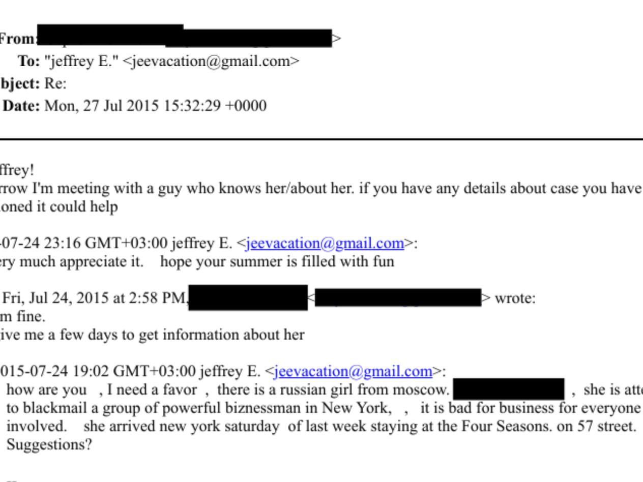 A year later, in 2015, he asked Belyakov to help find out about a certain girl from Moscow. Epstein wrote that she was blackmailing businessmen in New York.