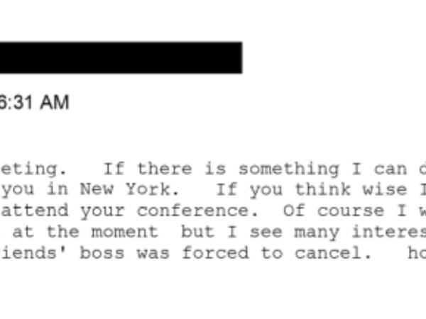 «I enjoyed our brief meeting. If I can help with anything, let me know. I hope to see you in New York. If you think it reasonable, I will ask a staff member to attend your conference. Of course, I will pay the usual fees. I know it«s difficult now, but I see interesting opportunities. I saw that your girlfriend»s boss was forced to cancel the meeting. How silly,» Epstein wrote to him.