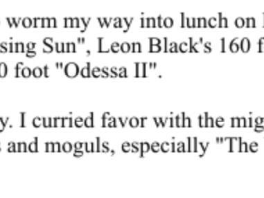 In 2014–2016, well-known Hollywood publicist Peggy Segal told Epstein about Abramovich. The first letter is dated January 2014, in which she recounted her flight on collector Peter Brant«s private jet and return from St. Barthélemy (a French-speaking island in the Caribbean). In passing, she mentions that during the New Year holidays she managed to sneak into a lunch on the 300-foot vessel »Luna« owned by Dasha and Roman Abramovich. Except that the couple celebrated New Year in frosty Moscow, not at a party with them.