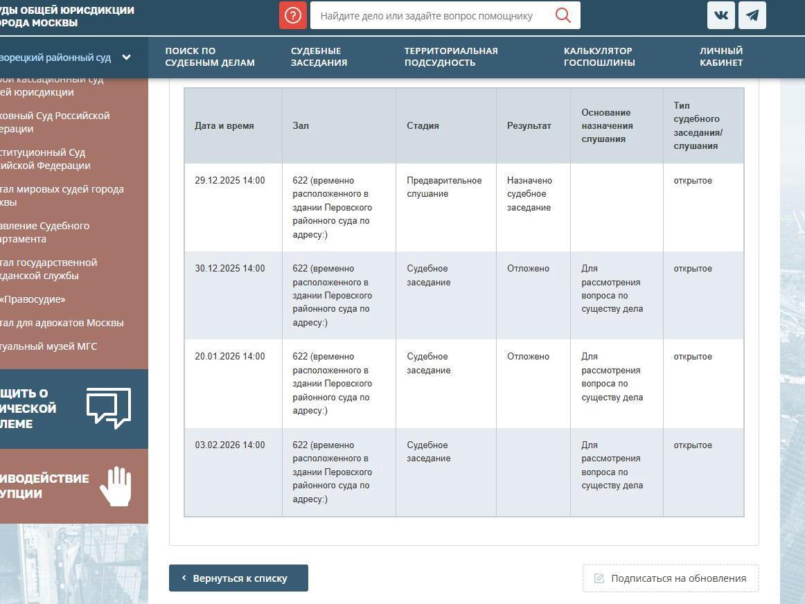 According to data from the Zamoskvoretsky District Court of Moscow, three hearings have already been held in this criminal case: on 29 and 30 December 2025, as well as 20 January 2026. The next session is scheduled for 3 February.