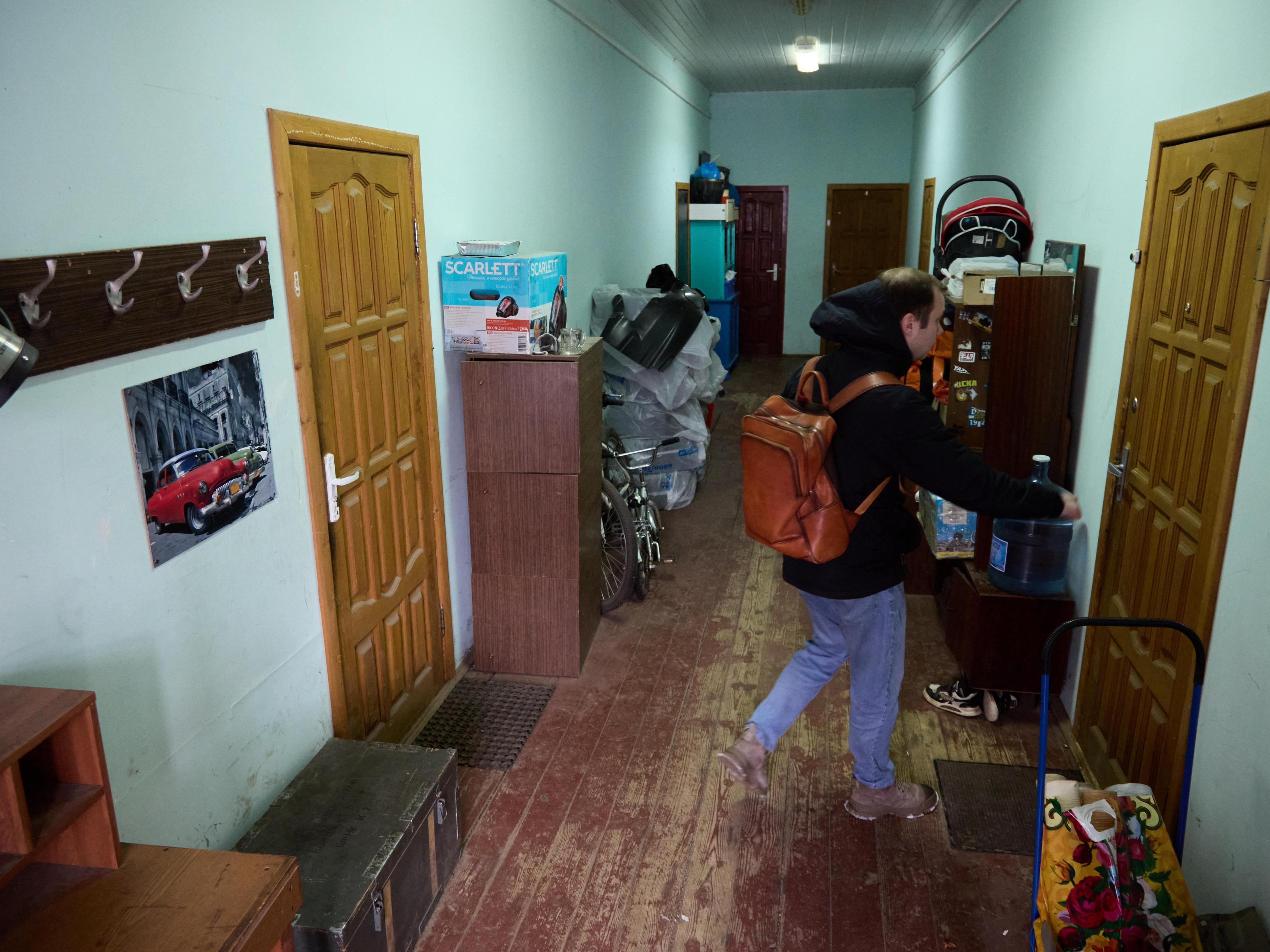 The entrance to one of the dormitories where migrants live — a former barracks.