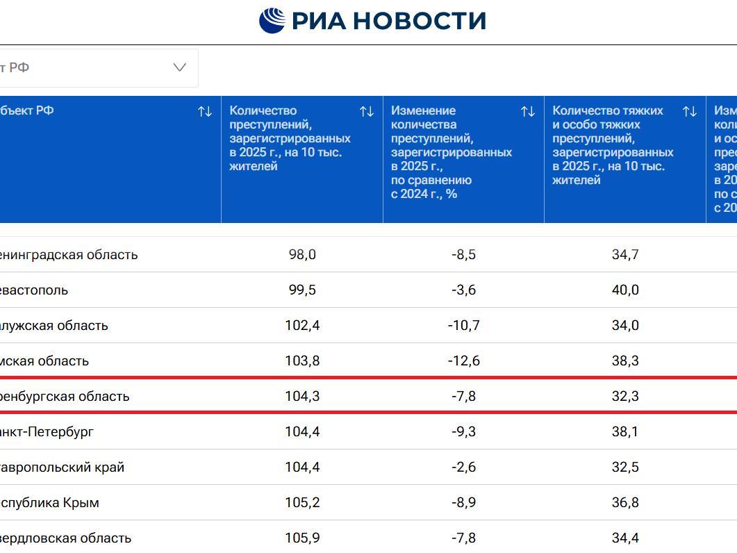 As for Orenburg Oblast, its rate is 104.3, and it decreased by 7.8% over the year. In the RIA Rating, the region took 25th place, placing between Omsk Oblast and St. Petersburg. At the same time, the number of registered serious and especially serious crimes compared to 2024 decreased by 2.3% and amounted to 32.3 per 10,000 people.