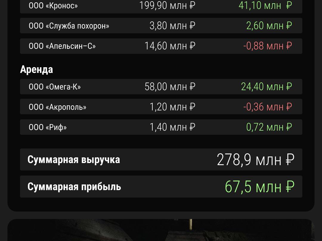 Funeral services are also provided by LLC «Apelsin-S» and LLC «Sluzhba Pokhoron» (Funeral Service). Several other Glukhov-owned firms (LLC «Akropol», LLC «Omega-K», LLC «Rif») earn money from renting and managing leased real estate.