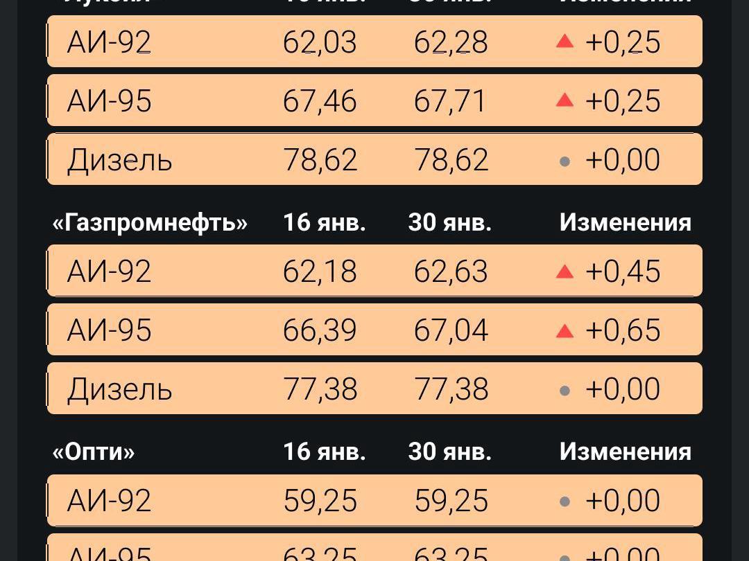 The most expensive AI-92 is currently at Gazpromneft gas stations. There, a liter of fuel costs 62.63 rubles (about $0.70 at current rates), which is 45 kopeks more expensive than two weeks earlier. Gasoline also became more expensive at Lukoil — by 25 kopeks, to 62.28 rubles (about $0.69 at current rates).