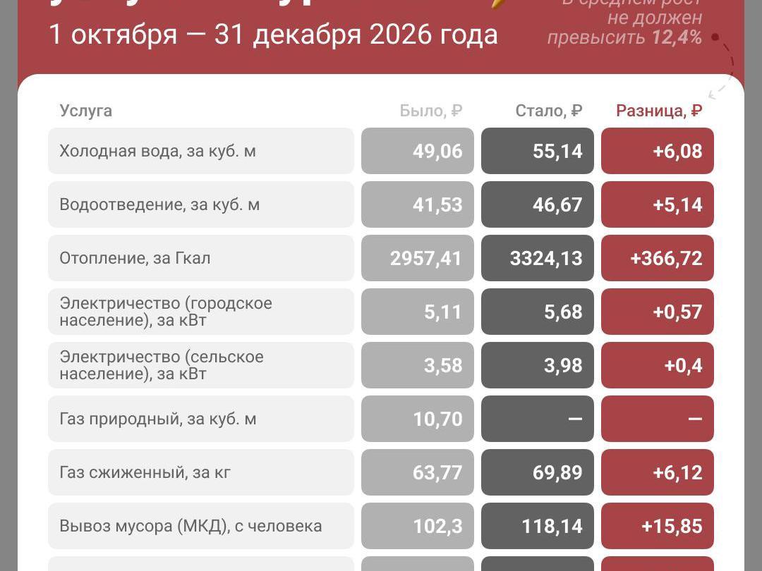 In Kurgan Oblast, utility services will become significantly more expensive from October 1 — on average by about 12.4% — which adds several hundred rubles to the bill. The new tariffs are presented in an infographic.