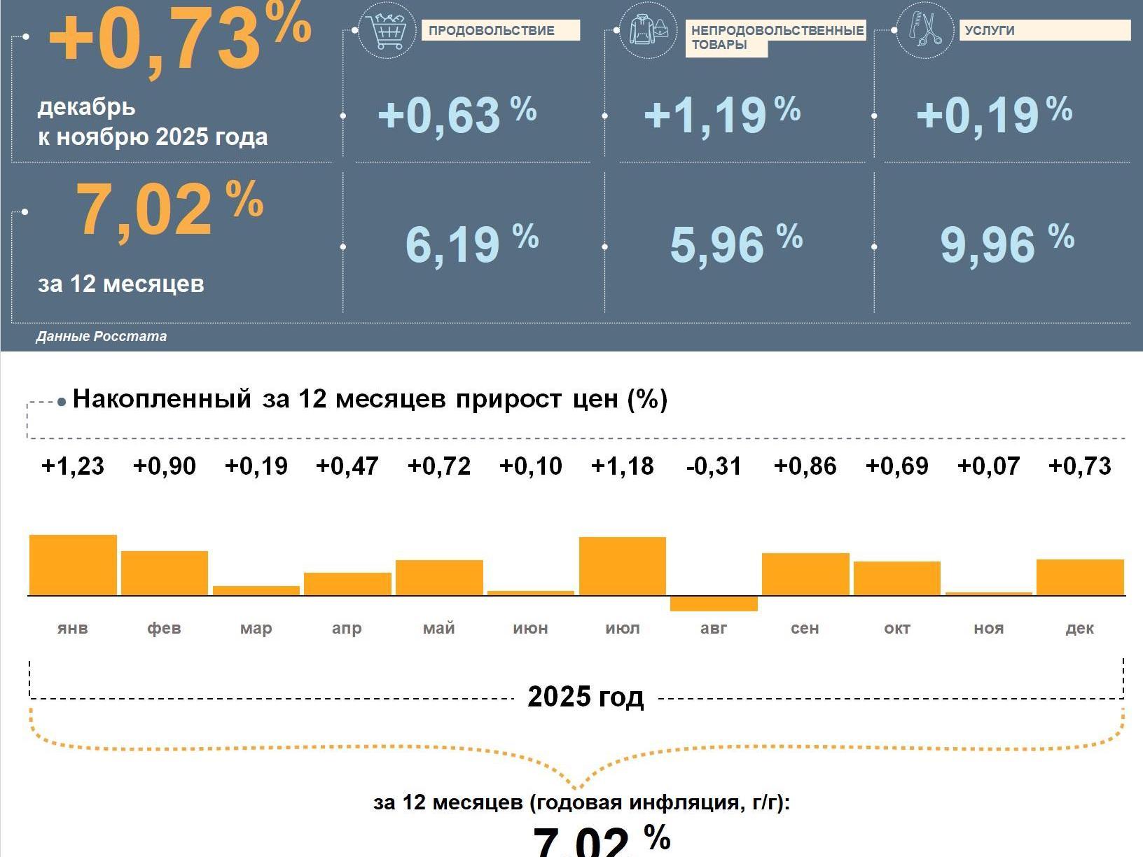 Annual inflation in the Tula region in December 2025 decreased to around 7%, while consumer prices rose by 0.73% in a month, according to an analysis of statistics and data from the regional branch of the Bank of Russia.