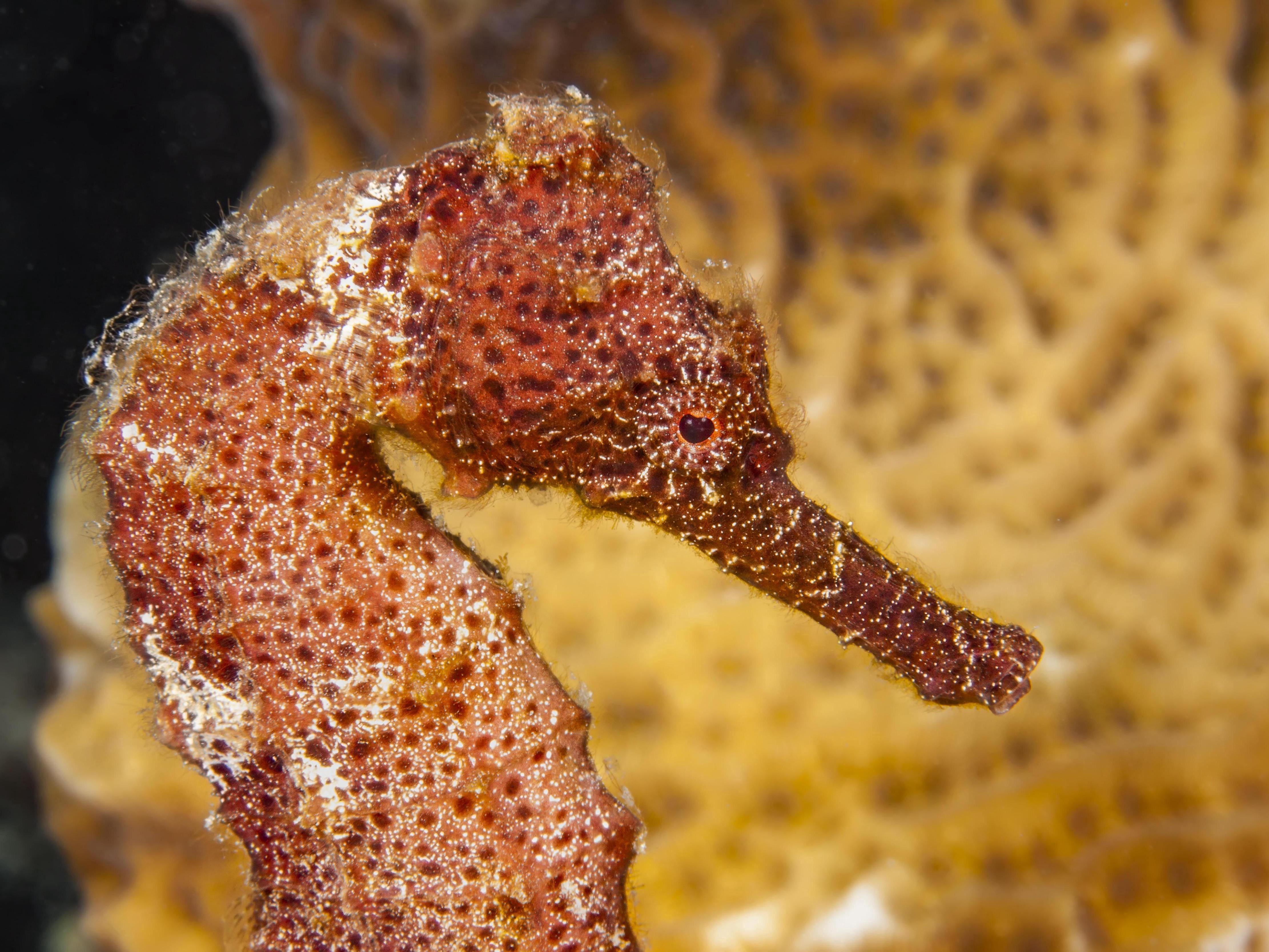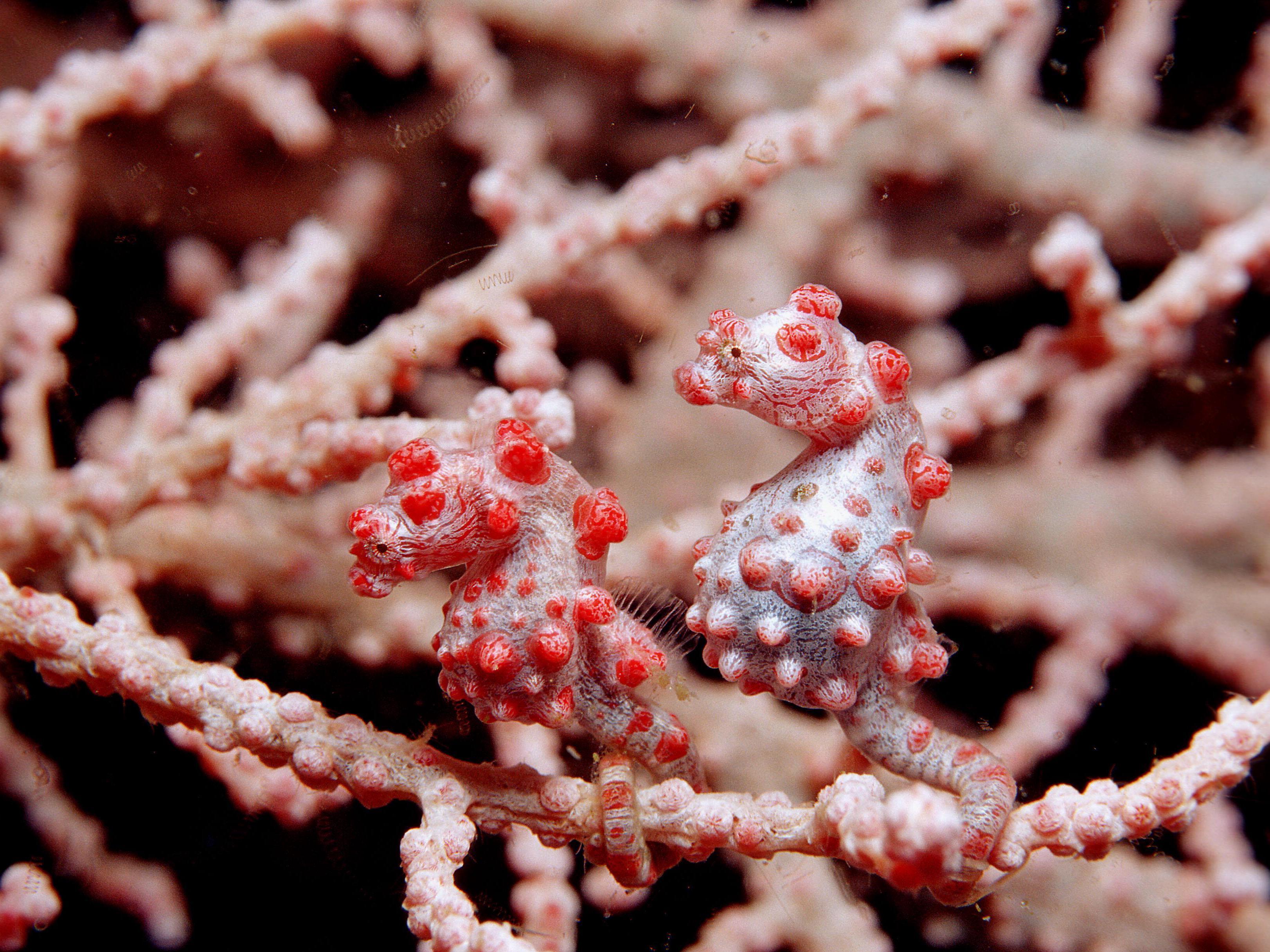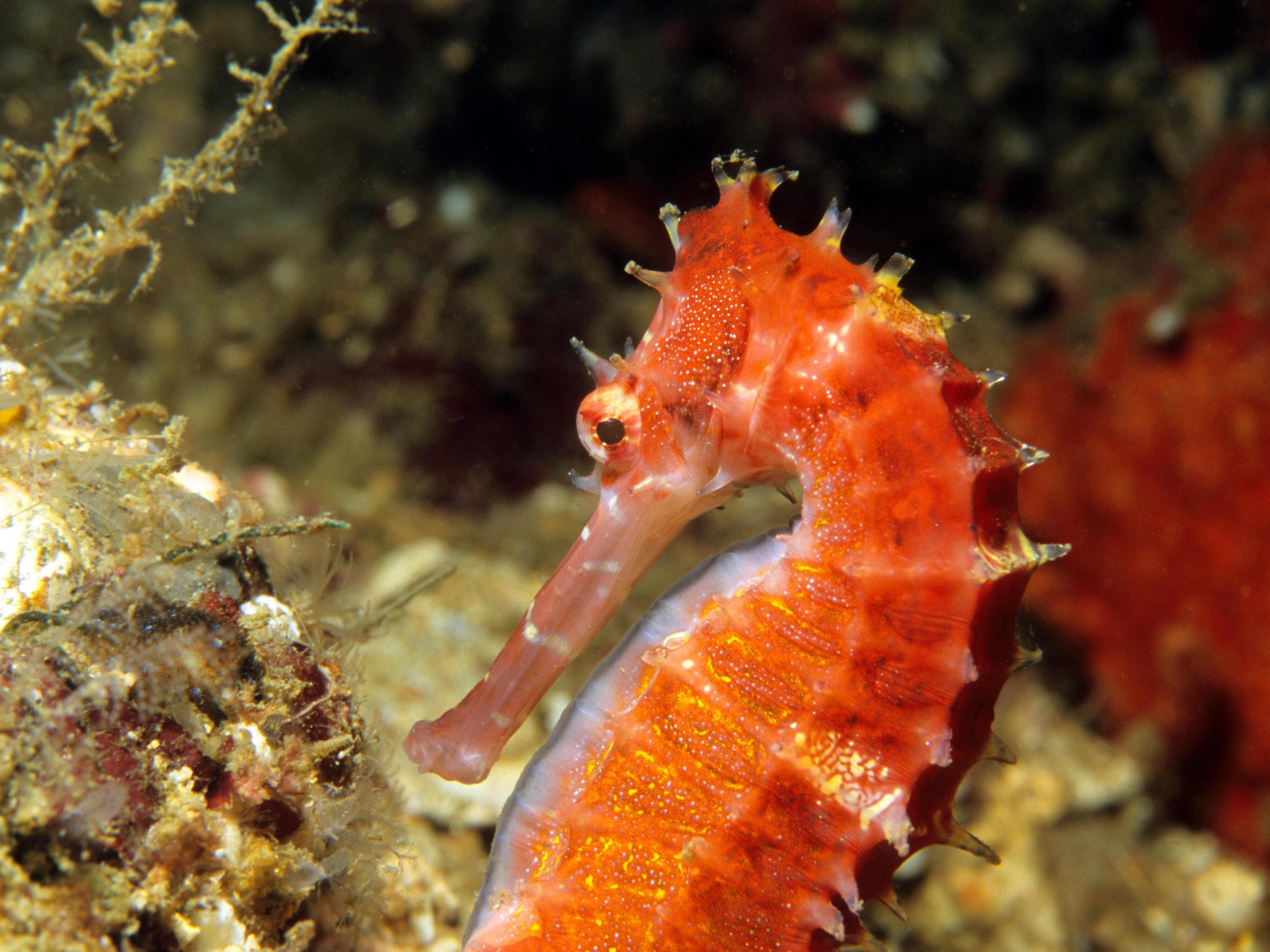 Their coloration usually matches their habitat: green shades for life among algae. However, in areas with bright corals, sponges, or jellyfish, one can find more colorful seahorses — fiery red, sunny orange, or spotted.