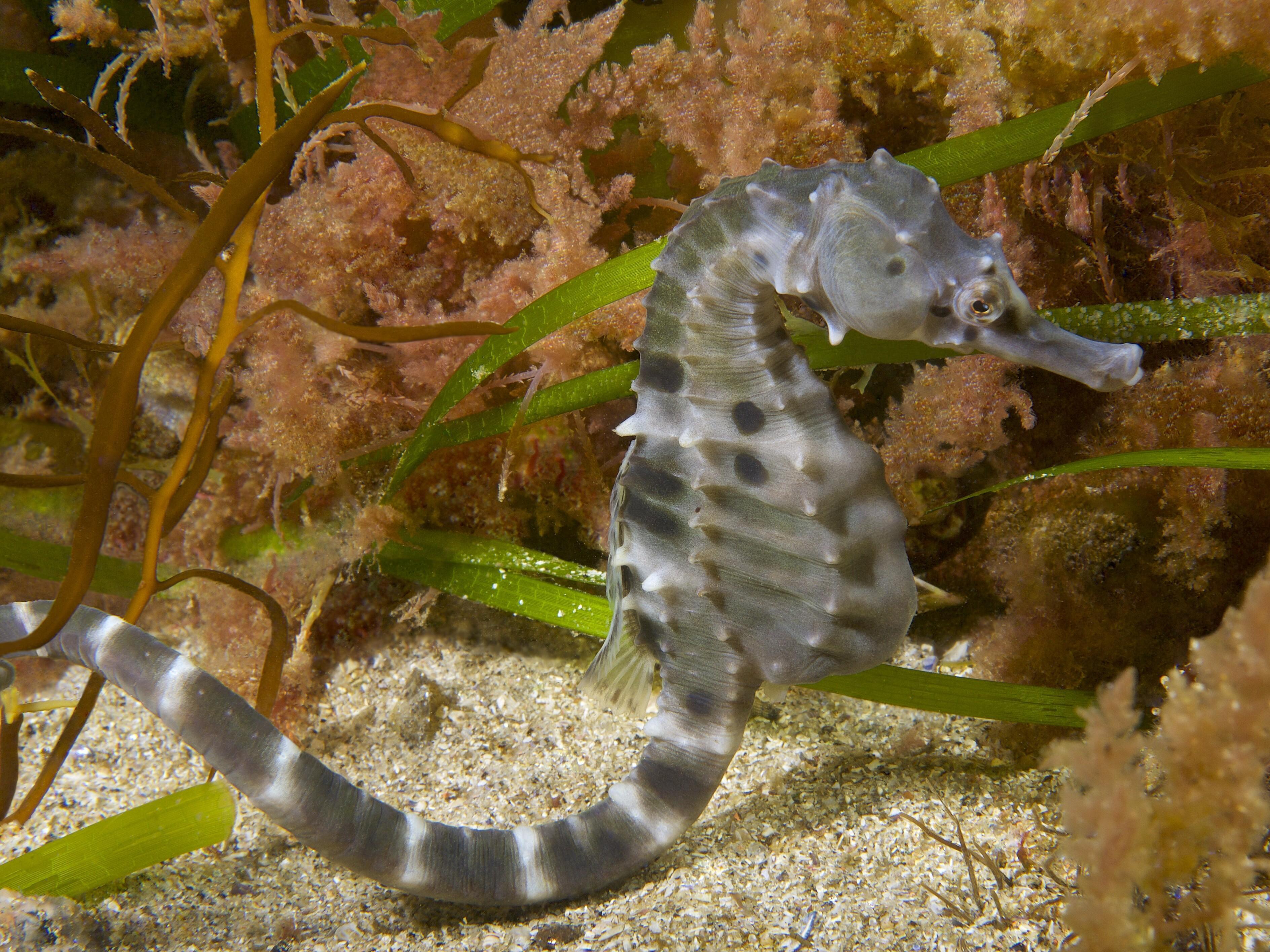 The rear part of the seahorse«s body has turned into a long, prehensile, and flexible tail, devoid of swimming function. However, it is perfectly adapted for grasping onto seaweed stems, coral branches, or each other. This allows the seahorse to firmly hold its place even in fairly strong currents.