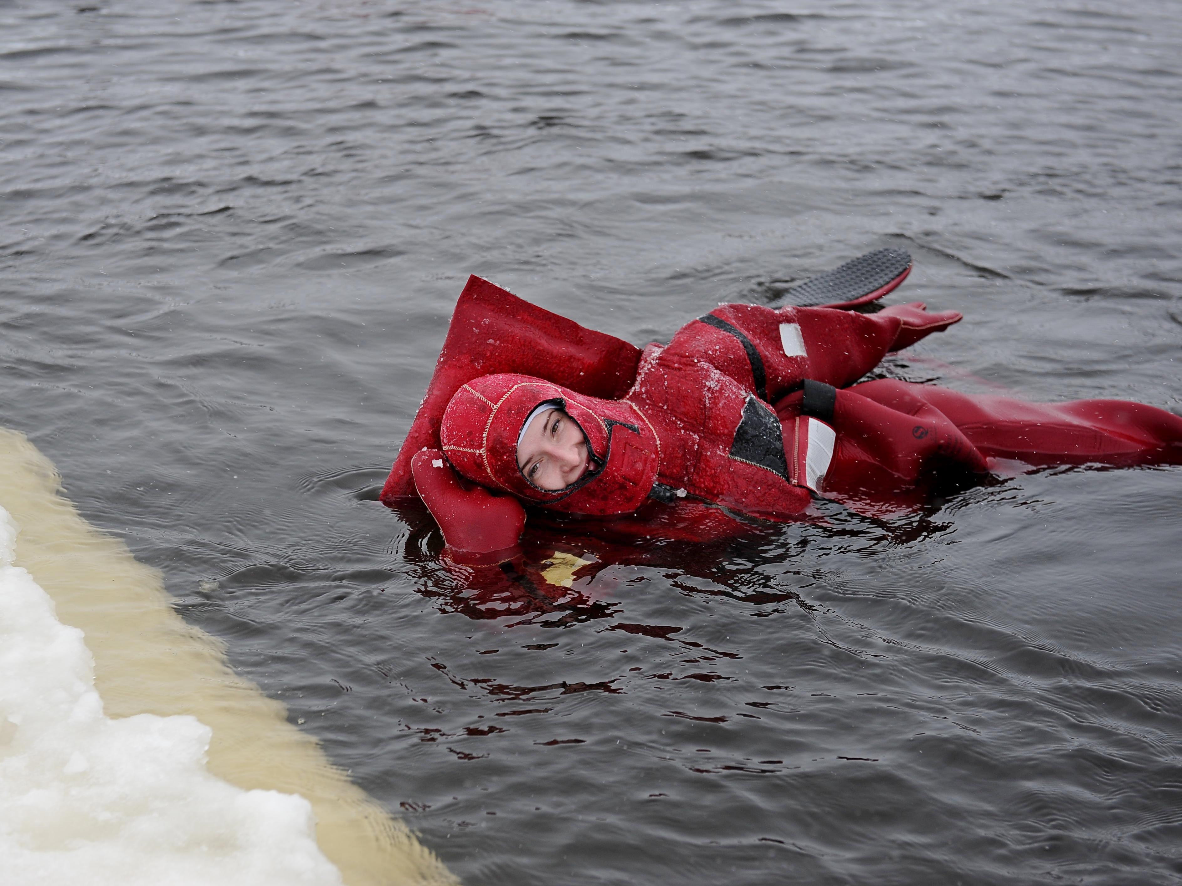 «Here is a calm bay and the current is almost absent. Can you go under the ice? If you force yourself under the edge of the ice, then, perhaps, with some attempt, you can get there. But the suit is buoyant, it keeps you on the water,» the girl reassures us.