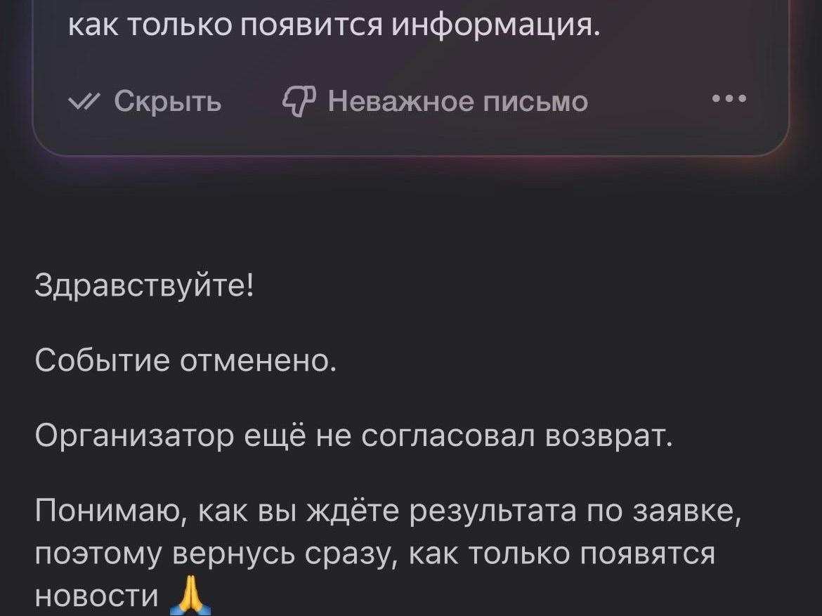 «The commission (in my case 1500 rubles (about $20 at current rates)) was not refunded to me, citing their rule which contradicts the consumer protection law. The support service responds with generic replies, meanwhile over 4000 seats were sold, meaning over 3 million rubles (about $40,000 at current rates) collected by the company for nothing (729 rubles (about $10 at current rates) commission per ticket),» shared a reader.
