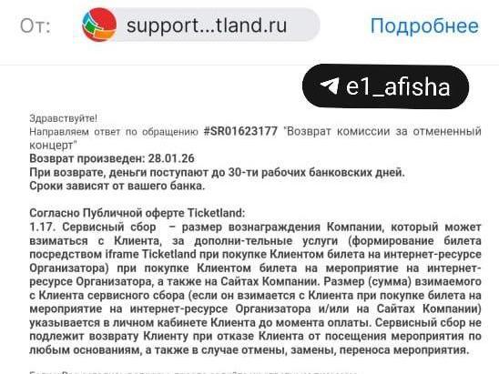 Lawyer Georgy Krasnov explained to E1.RU that when a concert is canceled, viewers have the right to a full refund of all funds paid for the ticket, including any service and additional fees: