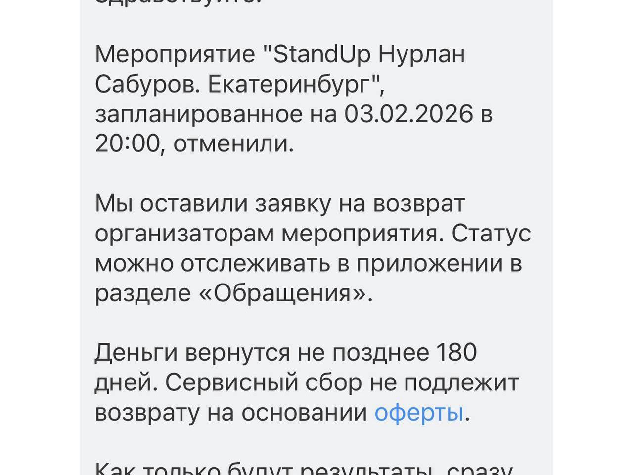In Yekaterinburg, a concert by famous stand-up comedian Nurlan Saburov has been canceled. It was supposed to take place at MTS Live Hall on February 3. Now many fans cannot get their money back. According to E1.RU readers, organizers are only refunding the ticket price, but not the service fee.