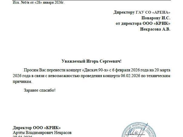 Lada-Arena published an official letter announcing the cancellation of one of the most anticipated events of winter 2026. It was scheduled to take place on February 6 and transform the ice rink into a giant dance floor.