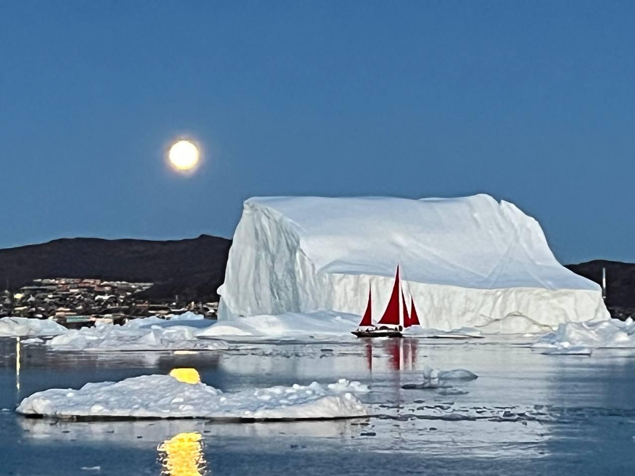 Despite Aurora being a reliable yacht, a sailor was constantly stationed on the bow with a five-meter bamboo pole to push away ice floes. They traveled under motor power—sailing among the ice is dangerous due to the risk of damaging the vessel«s hull. Moreover, during the warm season in Greenland, there is almost always a calm. However, for a beautiful shot, they did raise scarlet sails on Alenka, but they were more for show.