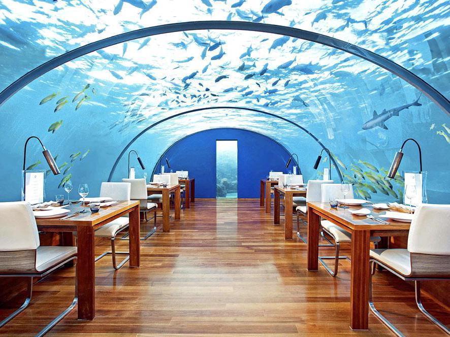 In the Maldives, on Rangali Island, lies one of the world«s first underwater restaurants. At a depth of five meters, under an acrylic dome, a 180-degree view opens up to coral gardens and their inhabitants: sharks, rays, colorful fish. The restaurant proved its durability by withstanding the 2004 tsunami without damage and remains the benchmark for underwater hospitality.
