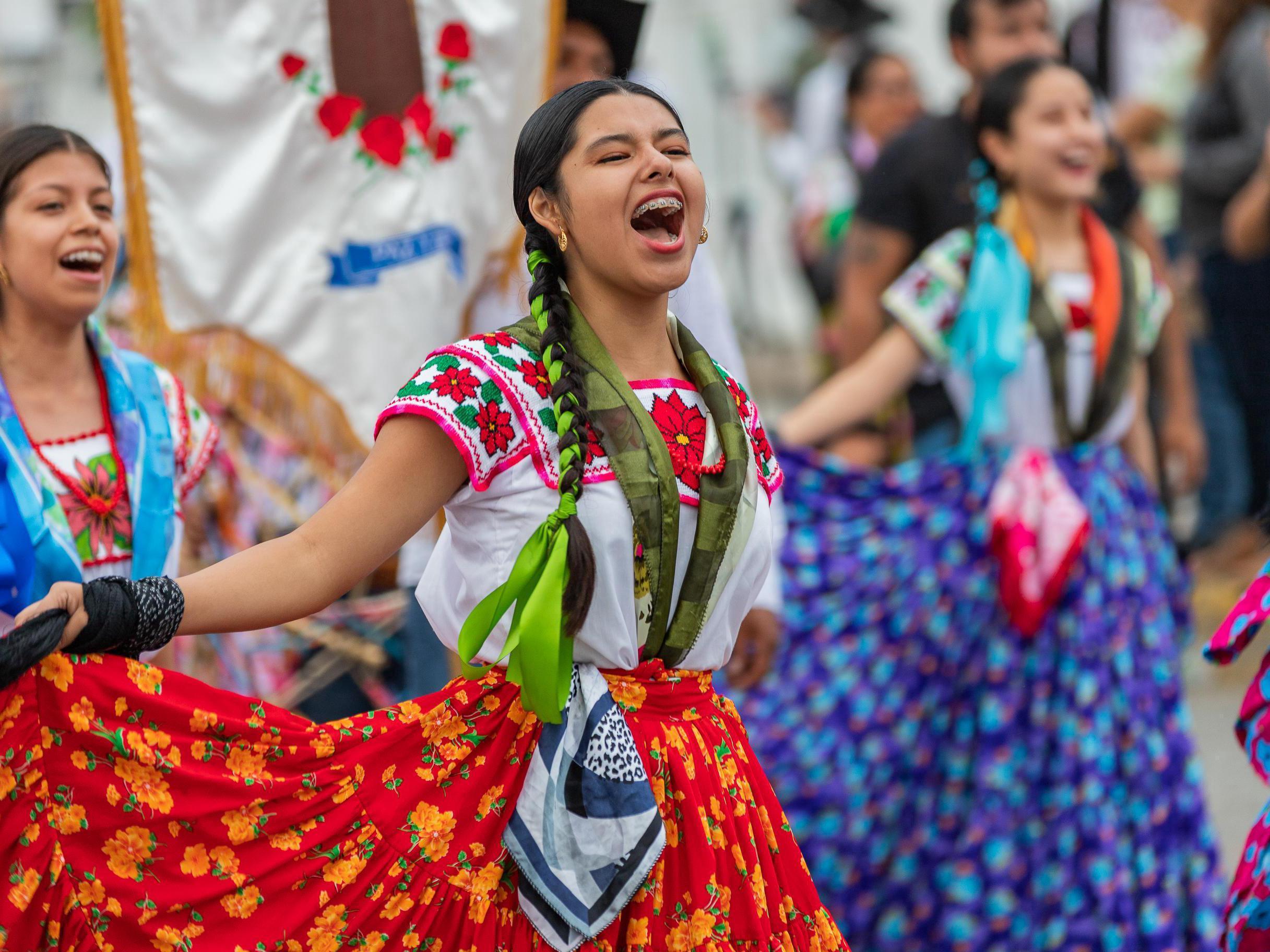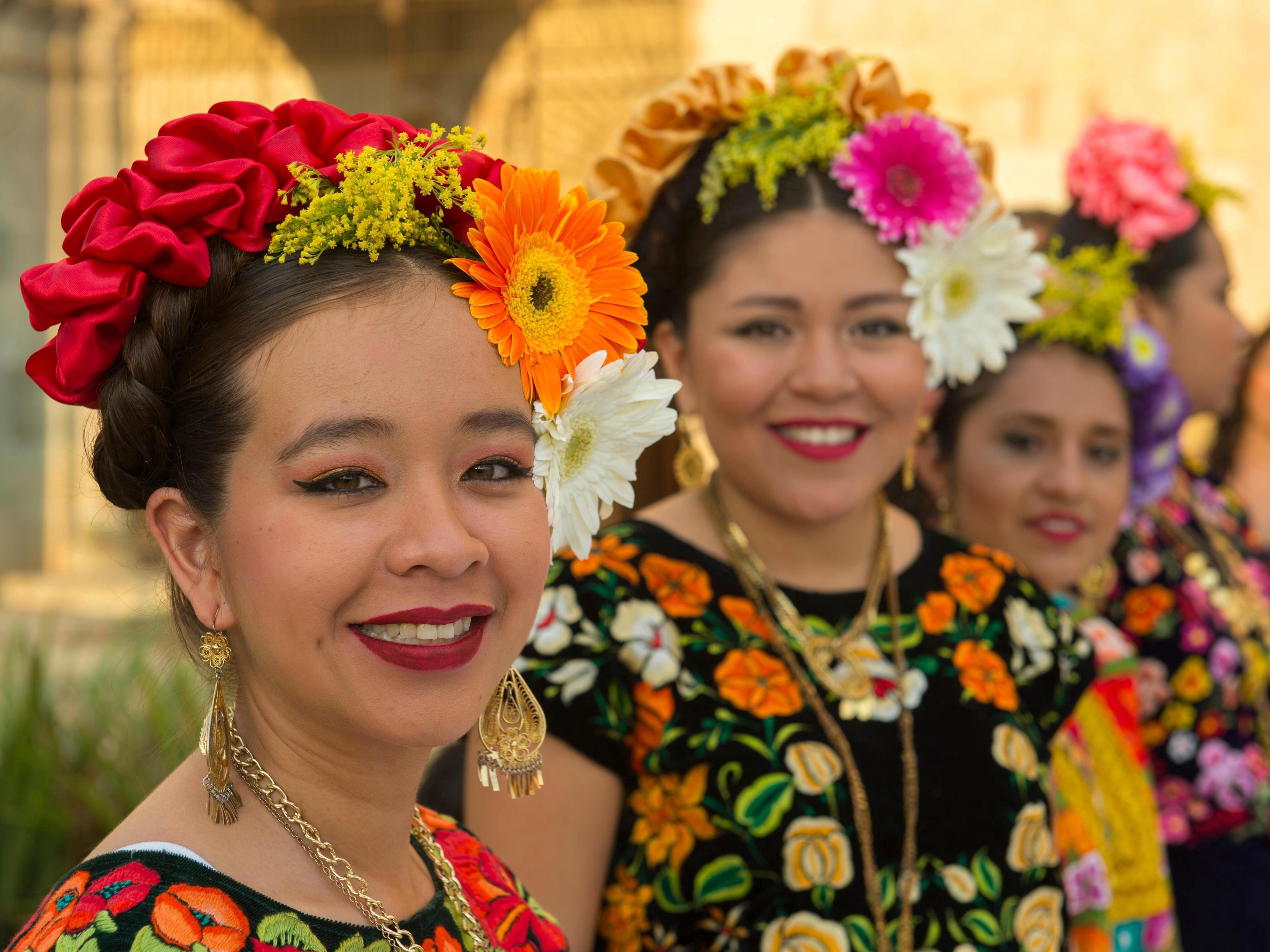 Women in huipils participate in the Guelaguetza festival, celebrating indigenous heritage in Oaxaca.