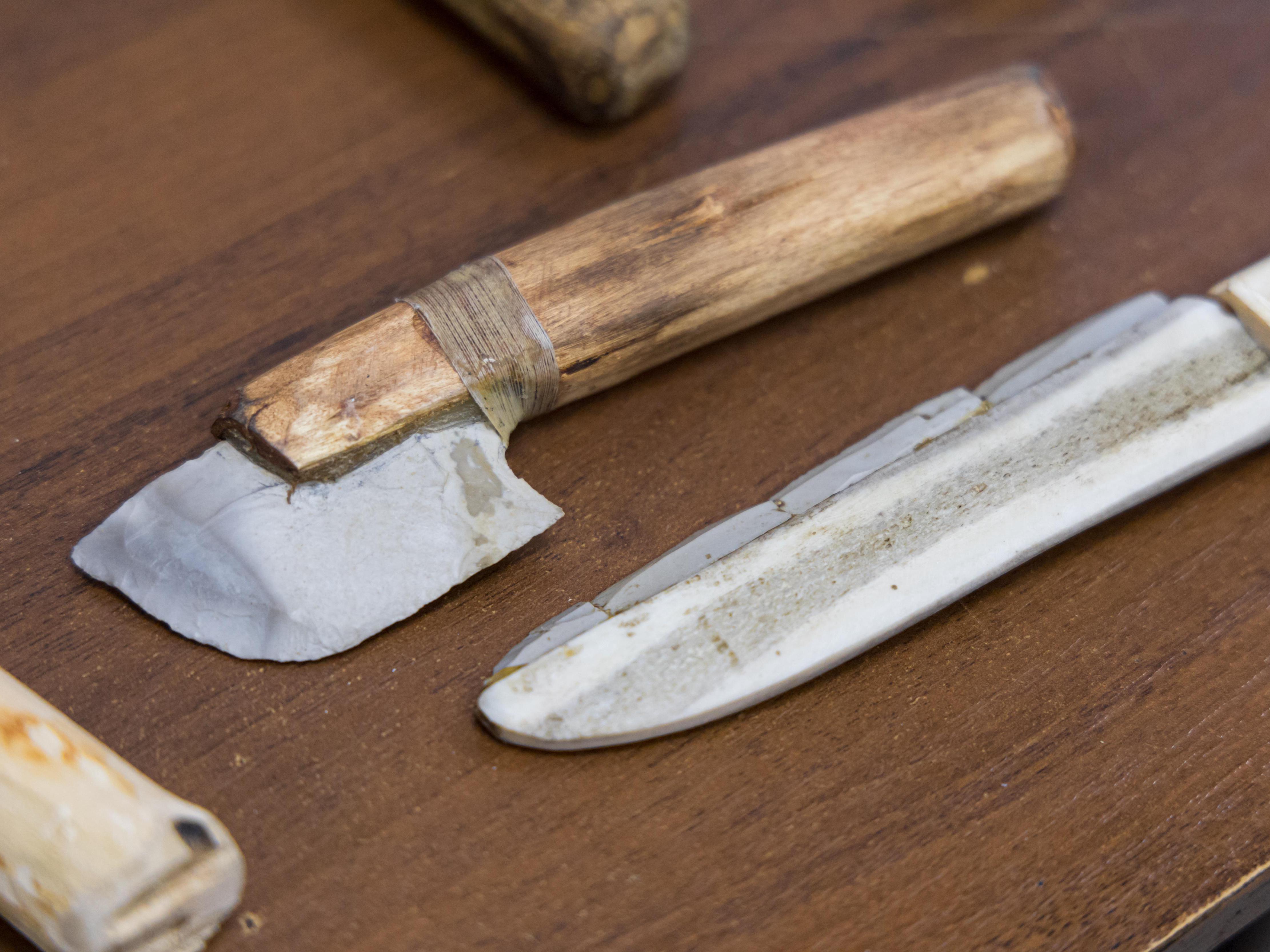 — Probably a scraper. These knives, a set of bone knives. For skinning hides, cleaning fish. You can peel potatoes. You need to understand that humans very actively started making tools not only from stone. They used wood, but it hasn«t survived to us. And bone. It does sometimes reach us. These are even African things. The most primitive. These are Neolithic knives. Such knives are found in Switzerland, in lake settlements. They come with handles like this.