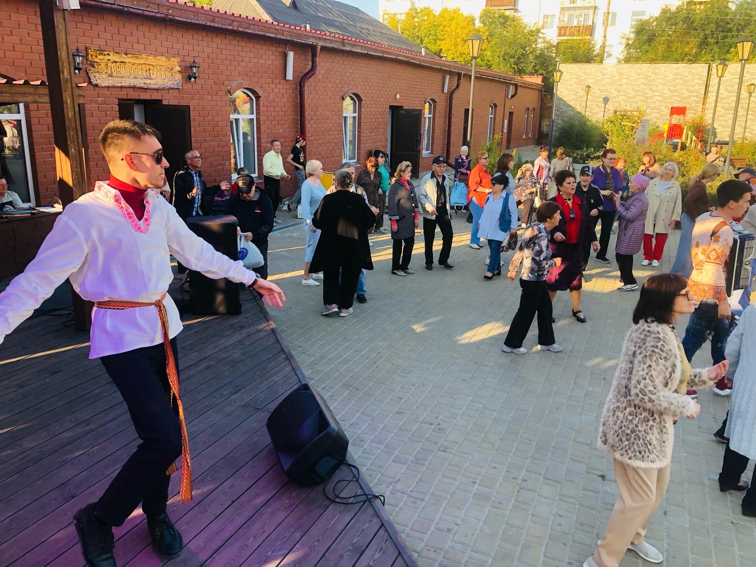 Once, in bad weather, he had to hold the dances inside the building called Gorod masterov (City of Craftsmen) here in the square — in earlier times it was a merchant stable, and now, under the museum, it hosts creative master classes, with a pottery workshop operating in summer. The small space quickly filled with dancers, and the evening passed in a slightly cramped but cozy setting.