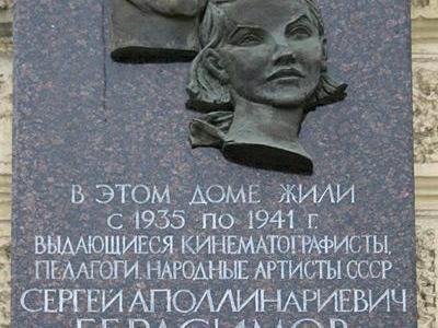 One example is a commemorative sign on building No. 6 on Mira Street in the Petrogradsky District. It is installed in honor of director Sergei Gerasimov and actress Tamara Makarova. Gerasimov, a People«s Artist of the USSR, though born in Chelyabinsk Oblast, and Makarova, born in St. Petersburg, both taught at VGIK (the All-Russian State University of Cinematography) and were buried in Moscow. However, part of their lives is closely connected with Leningrad.