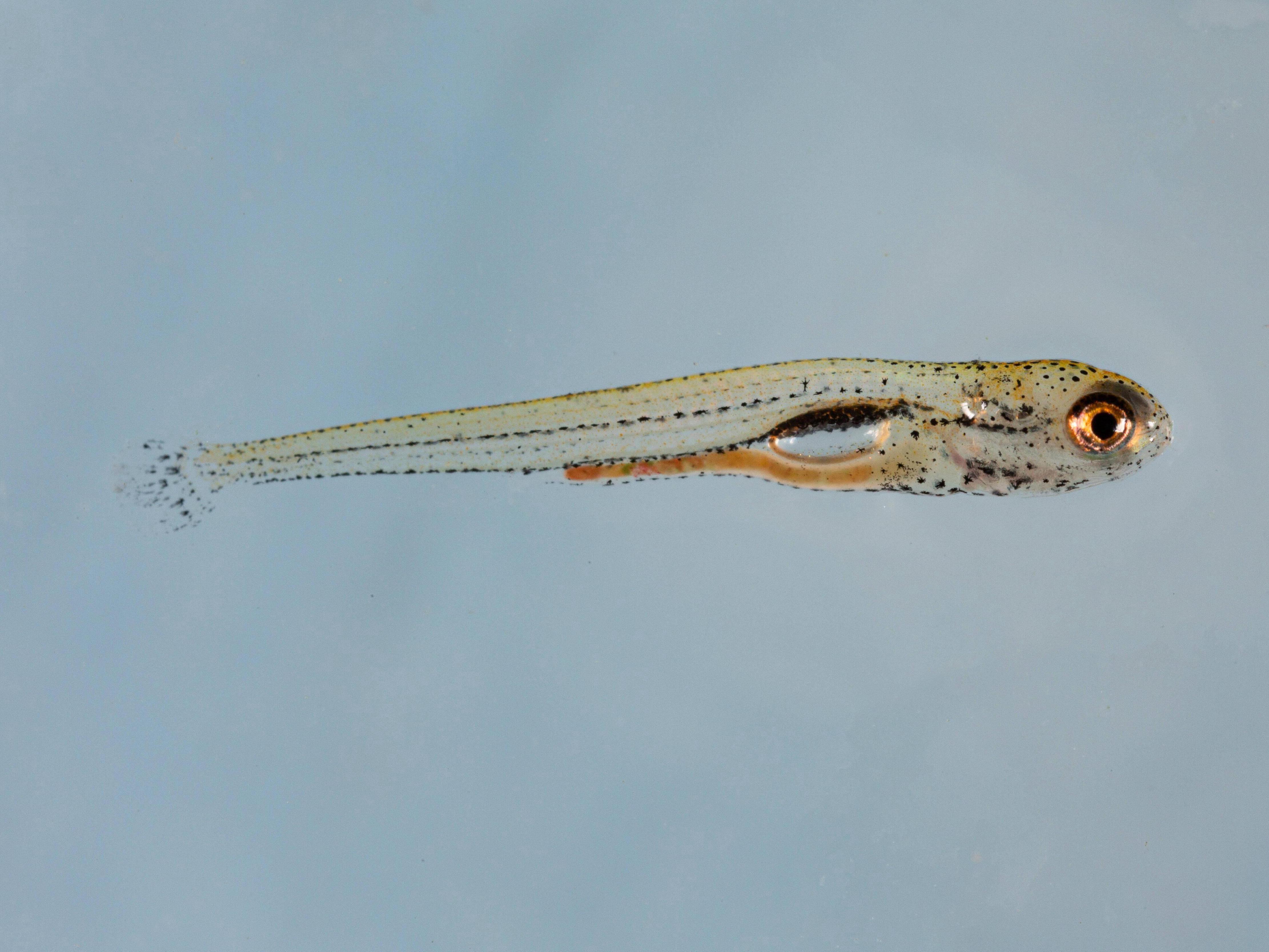 The fry quickly switch to feeding on microscopic crustaceans and insect larvae. With a good food base, by the end of the first summer of life they can grow to 4–5 centimeters (1.6–2 inches).