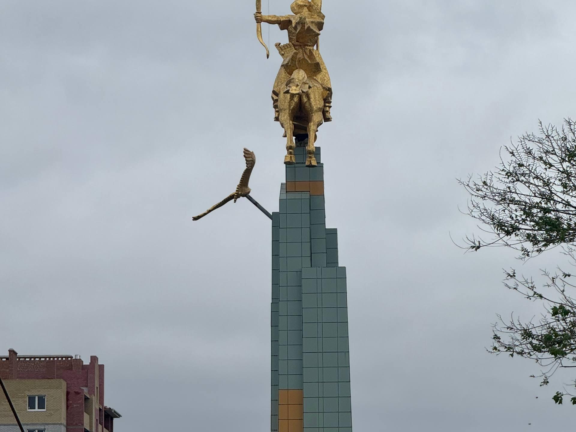 Already on the way back, we stopped to look at the sculpture of the Golden Horseman — a monument to the hero of the folk epic «Jangar». Covered in gold leaf, it is located on a 15-meter (49-foot) stele installed on an artificial mound.