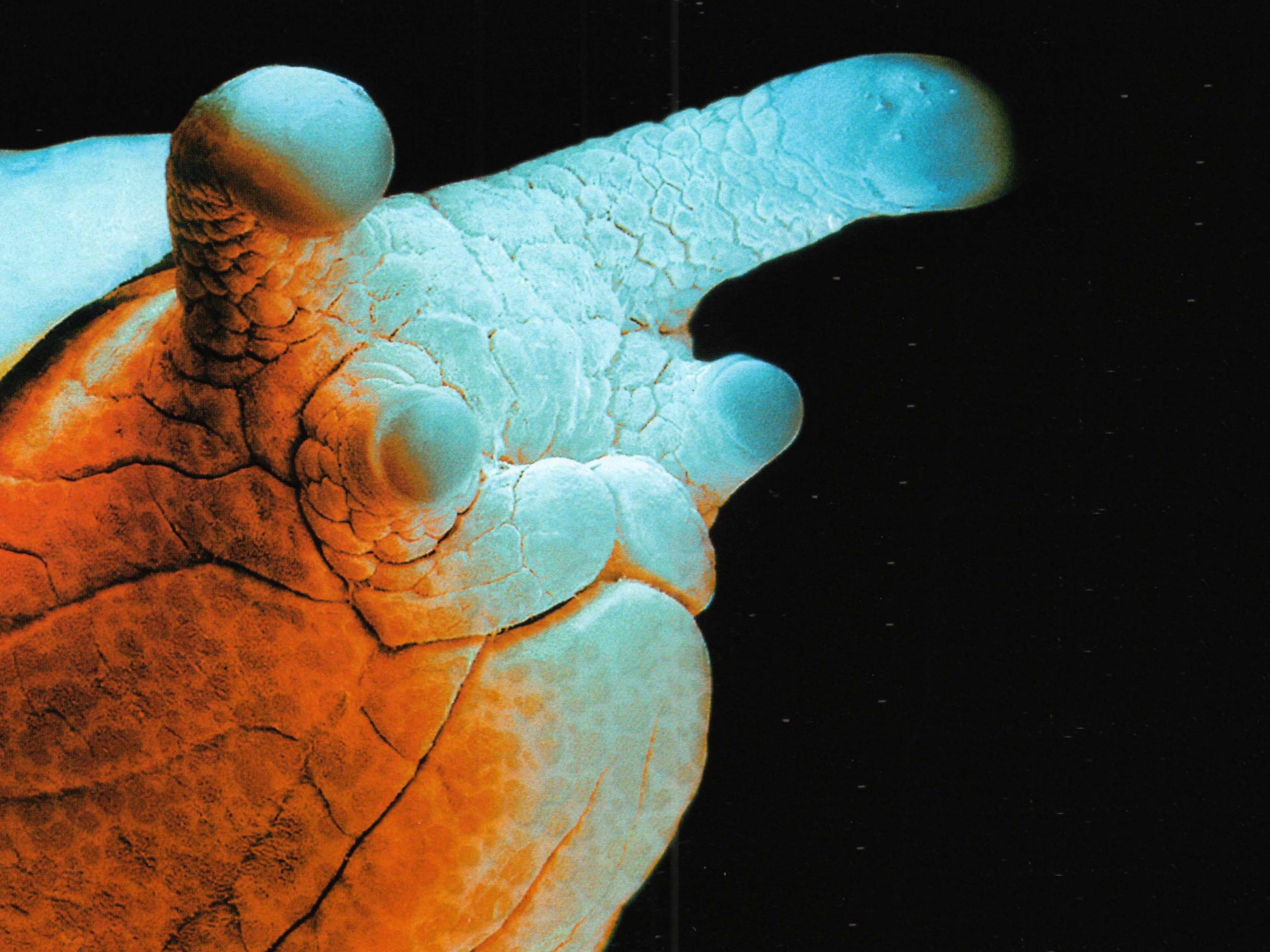 Scanning electron microscopy of the leg of a black vine weevil (Otiorhynchus sulcatus). The image shows two hairy adhesive pads (bottom center) and two curved claws (right center). The pads provide grip on smooth surfaces, while the claws help cling to rough substrates.