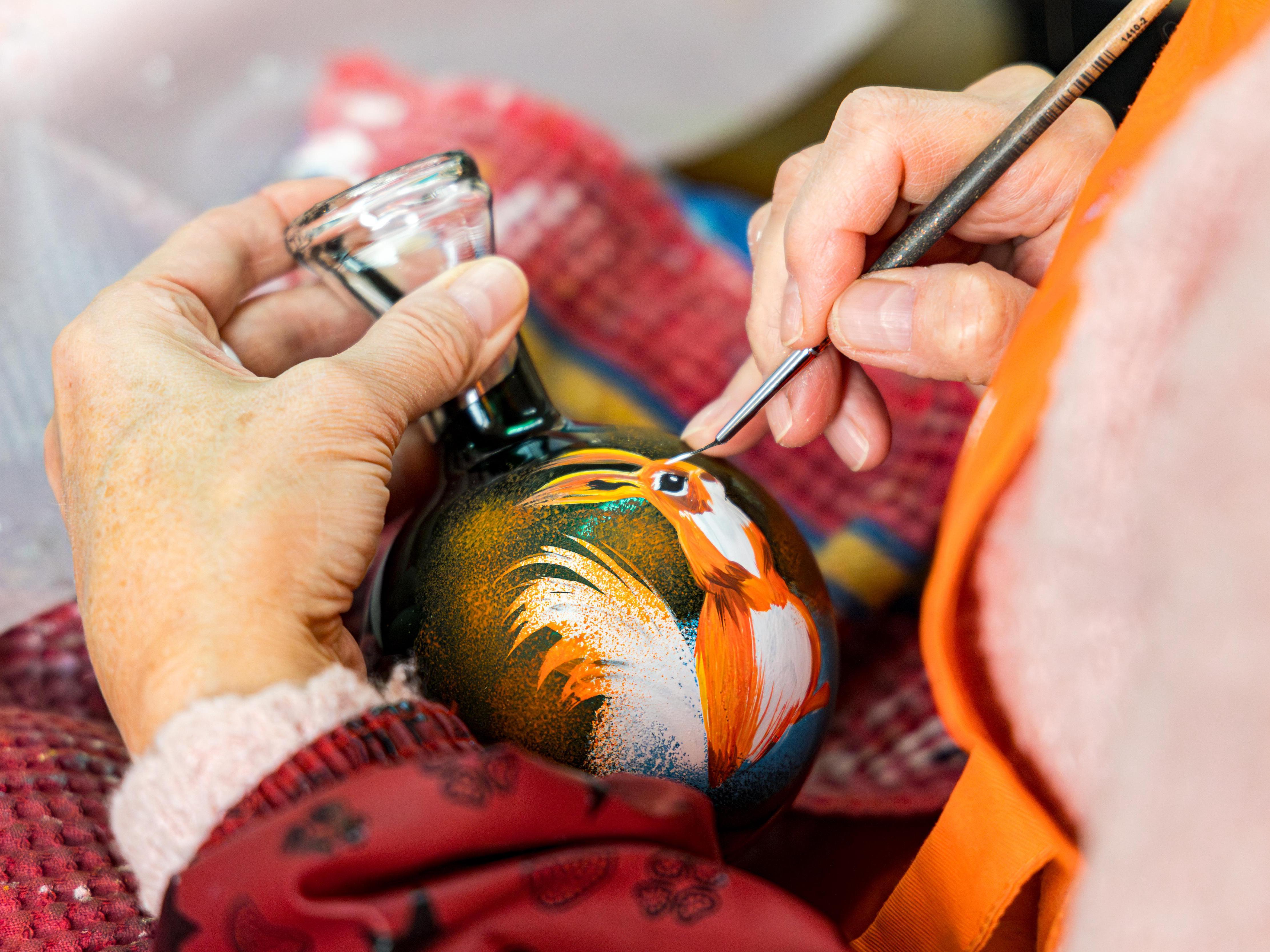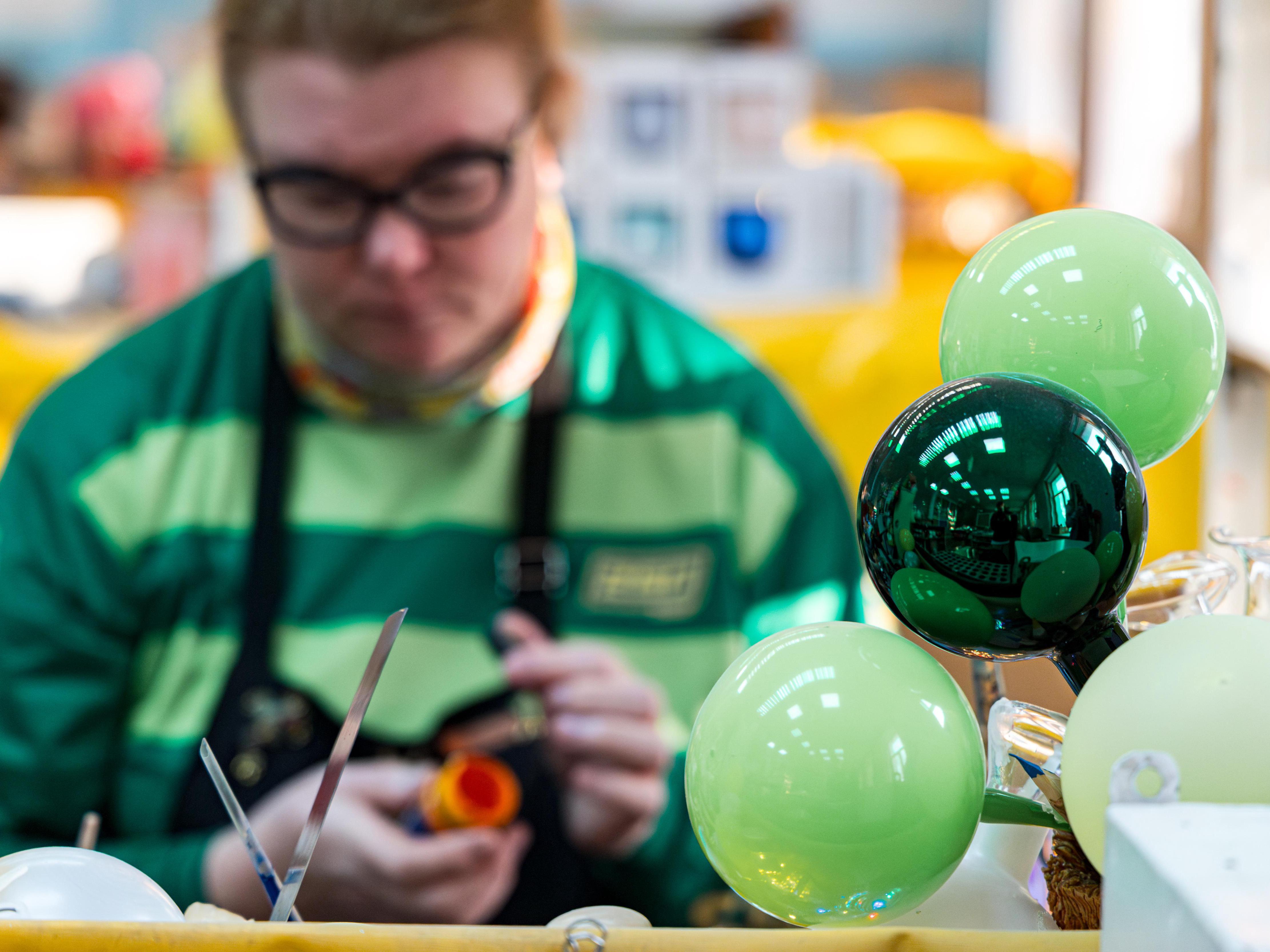 The profession of an artist painting Christmas balls, like that of a glassblower, is not taught in universities. Here, artistic abilities are important — everything else is taught right at the factory.
