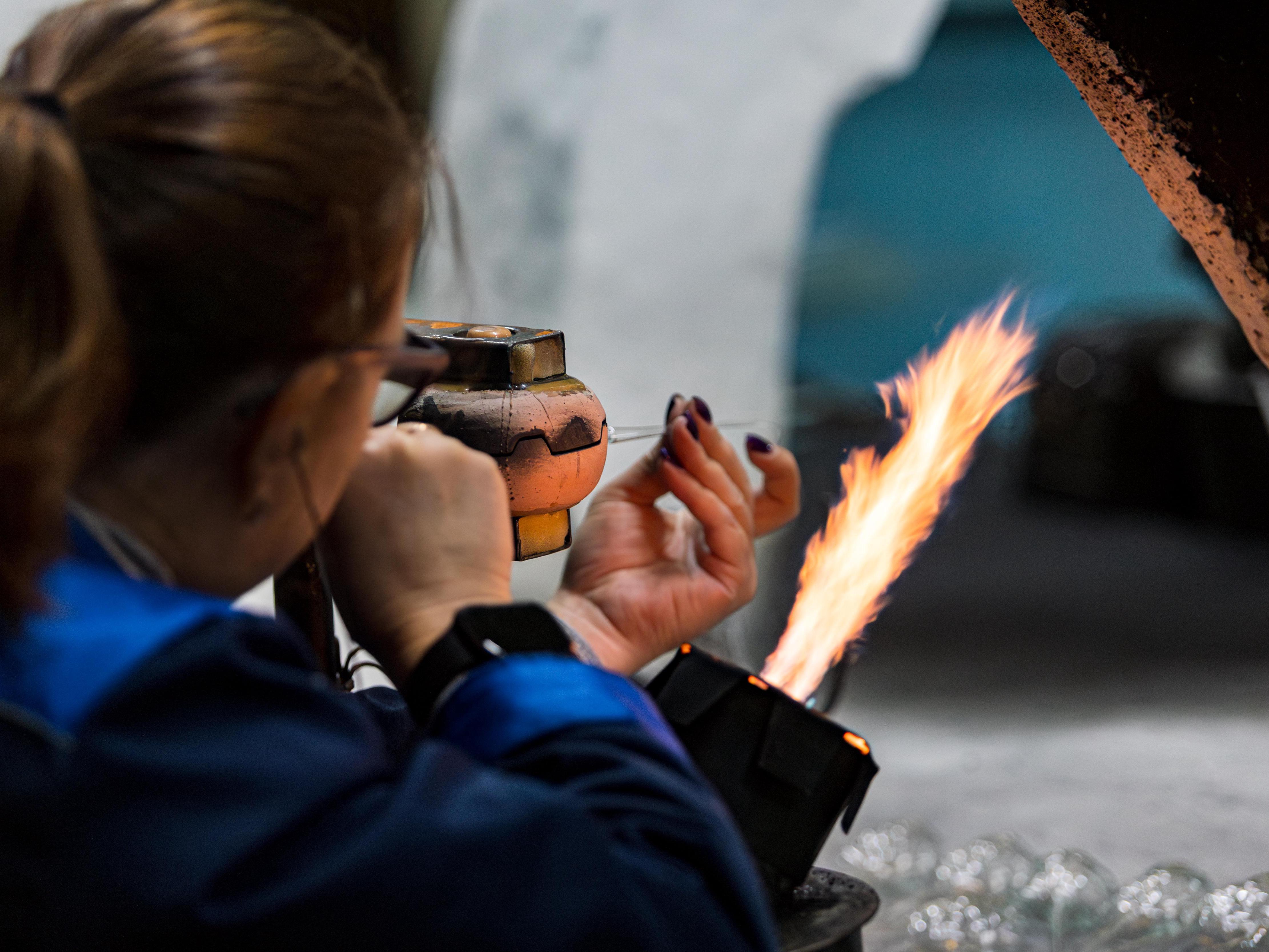 The glassblowing section at «Biryusinka» is a small workshop with high ceilings and a long row of workstations. At the tables sit masters, in front of each — that noisy exhaust and a kerosene burner. It needs to be refueled, turned on — and only then can you start working. We show the detailed process in our video at the beginning of the material.