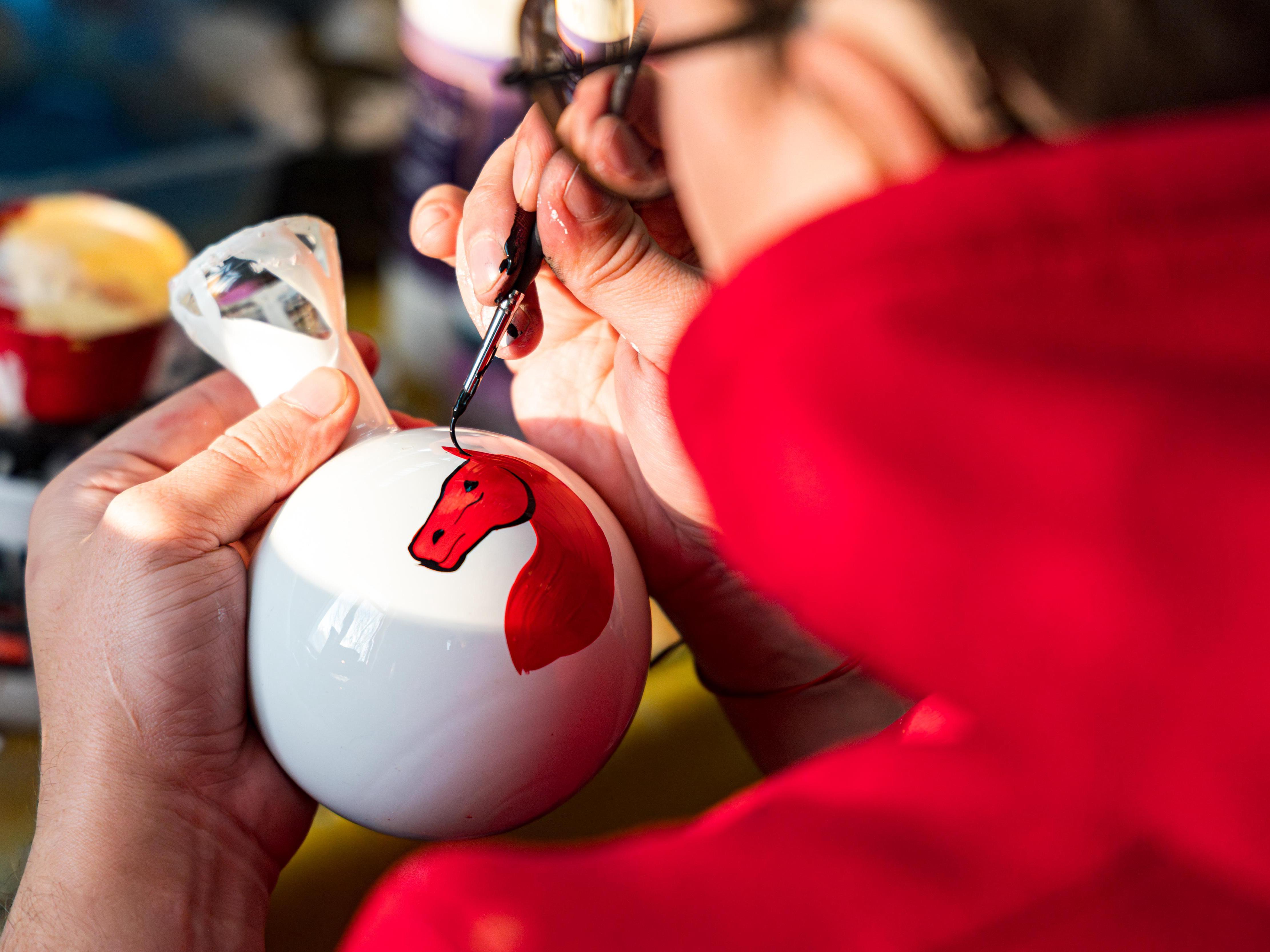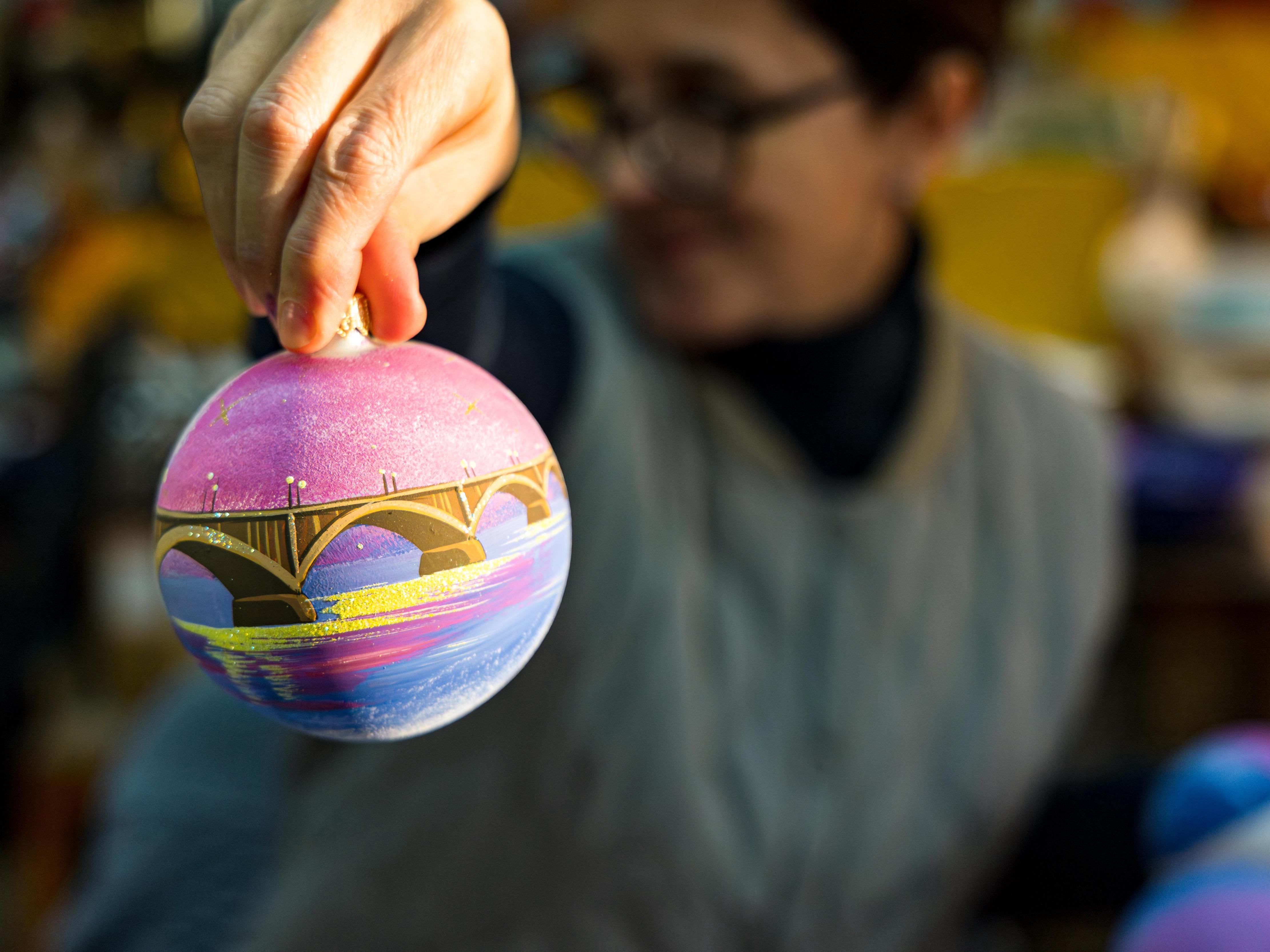 «It»s soothing,« says Anastasia Muracheva, looking up from painting an elegant ball with an image of a cable-stayed bridge. »I«ve changed many different jobs, but still the paths lead here. It»s calm here. You paint, switch off your mind, you can listen to music, books, some videos in the background...«