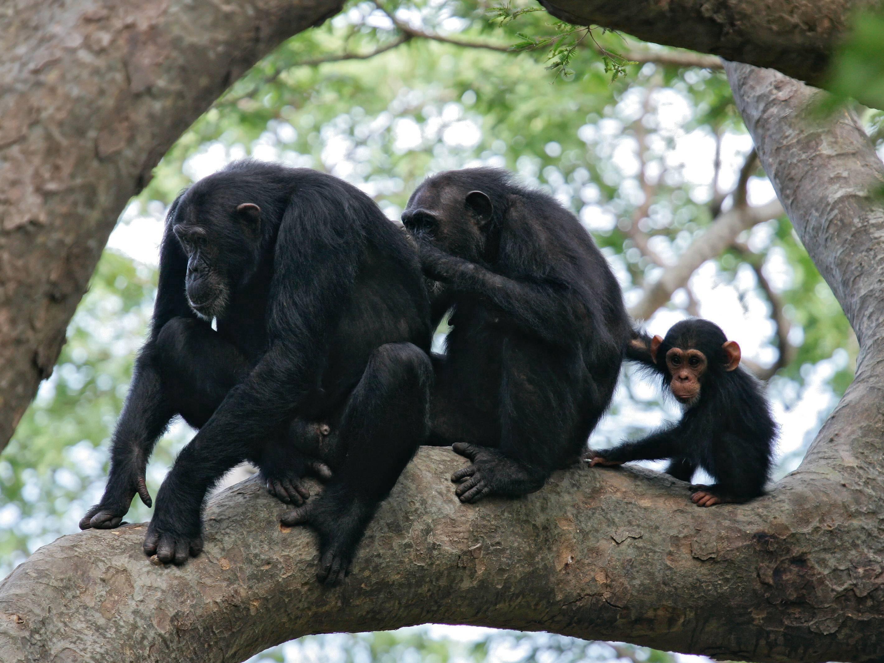 The behavior of chimpanzees in Mahale has long been documented by scientists, primarily Japanese primatologists from Kyoto University. They note that these primates greet each other by shaking hands, attract females« attention by noisily tearing leaves, and during rain perform the so-called »rain dance« — shaking branches and beating on tree trunks.