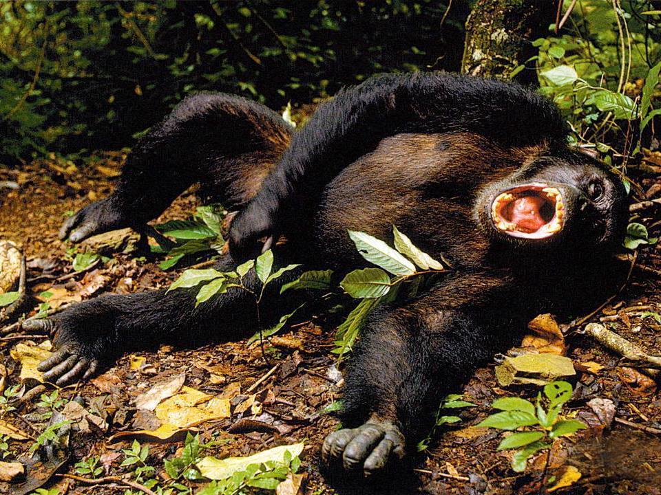 A dignified female with a baby no older than two years descends to him. «The licker» turns out to be her elder son — waking up, he begins gently picking through his mother«s fur. Meanwhile, the baby demonstrates acrobatic wonders, hanging now by an arm, now by a leg, playing with leaves and sticking out her tongue. It is a picture of family idyll, full of serenity and mutual trust.