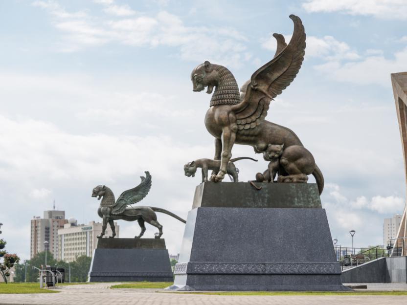 The sculptures were created by Russian artist Dashi Namdakov. Since the composition is located near a wedding palace, the zilanty symbolically guard the Family Center, embodying the inviolability of marital foundations and family traditions. The barsy act as patrons of children.