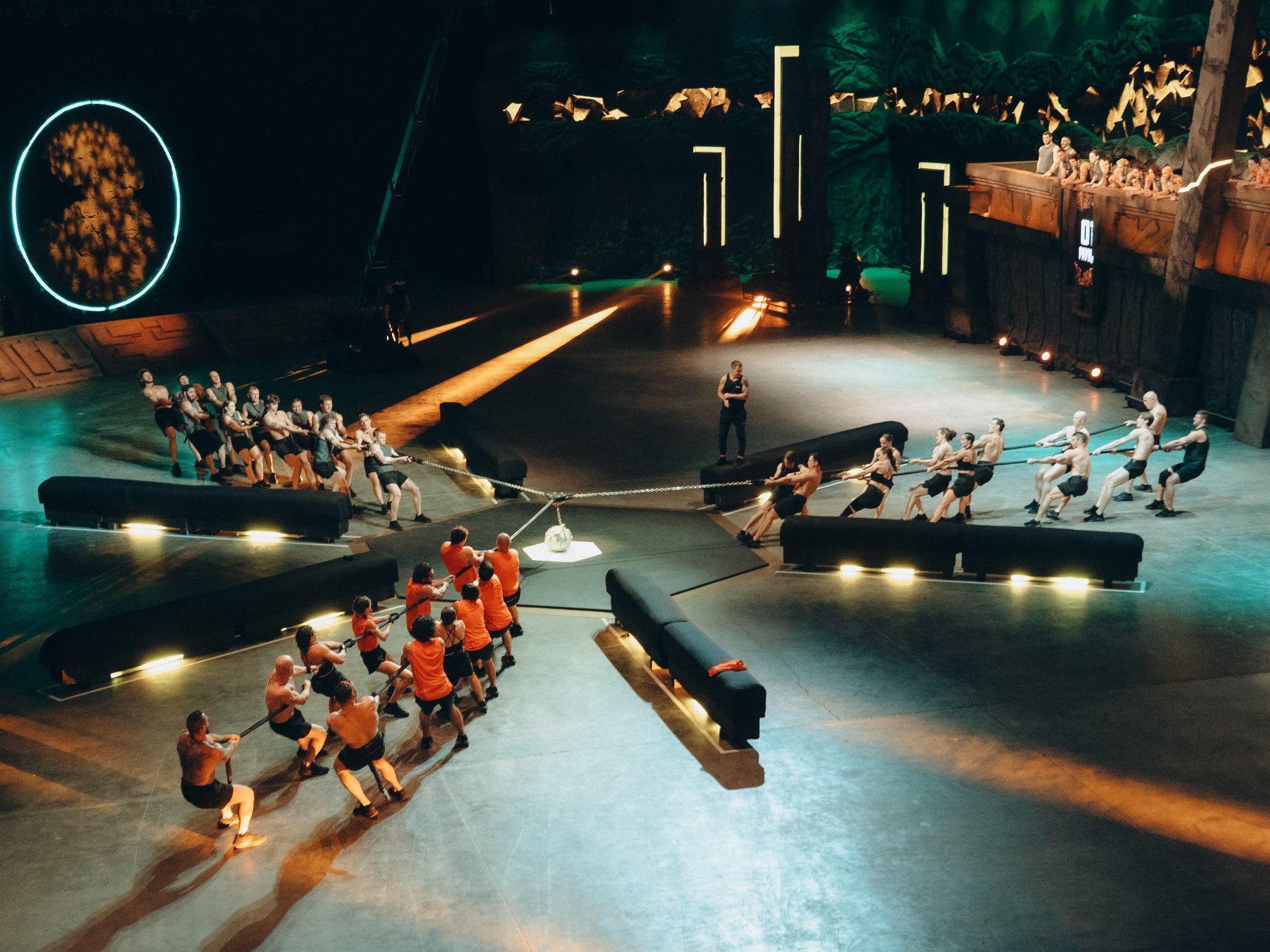 Teams compete in a three-way tug-of-war with a heavy load in the episode.